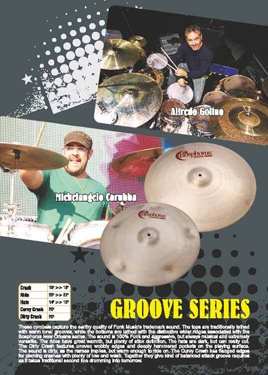 These Bosphorus Groove Series cymbals capture the earthy quality of Funk Music's trademark sound. The tops are traditionally lathed with warm tonal grooves, while the bottoms are lathed with the distinctive wider ridges associated with the Bosphorus New Orleans series. The sound is 100% Funk and aggressive, but always musical and extremely versatile.