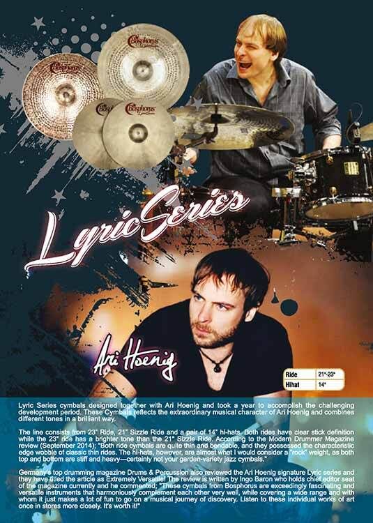 Lyric Series cymbals designed together with Ari Hoenig and took a year to accomplish the challenging development period. These Cymbals reflect the extraordinary musical character of Ari Hoenig and combines different tones in a brilliant way. The line consists from 23" Ride, 21" Sizzle Ride and a pair of 14" hi-hats. Both rides have clear stick definition while the 23" ride has a brighter tone than the 21" Sizzle Ride. According to the Modern Drummer Magazine review (September 2014); "Both ride cymbals are quite thin and bendable, and they possessed the characteristic edge wobble of classic thin rides. The hi-hats, however, are almost what I would consider a "rock" weight, as both top and bottom are stiff and heavy, certainly not your garden-variety jazz cymbals." Germany's top drumming magazine "Drums & Percussion" also reviewed the Ari Hoenig signature Lyric series and they have titled the article as Extremely Versatile! The review is written by Ingo Baron who holds chief editor seat of the magazine currently and he commented; "These cymbals from Bosphorus are exceedingly fascinating and versatile instruments that harmoniously complement each other very well, while covering a wide range and with whom it just makes a lot of fun to go on a musical journey of discovery. Listen to these individual works of art once in stores more closely. It's worth it!"