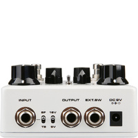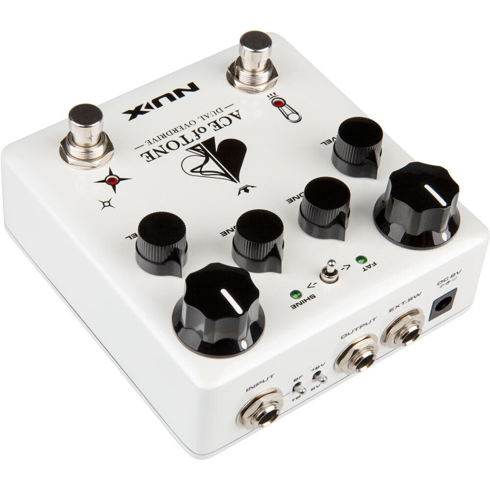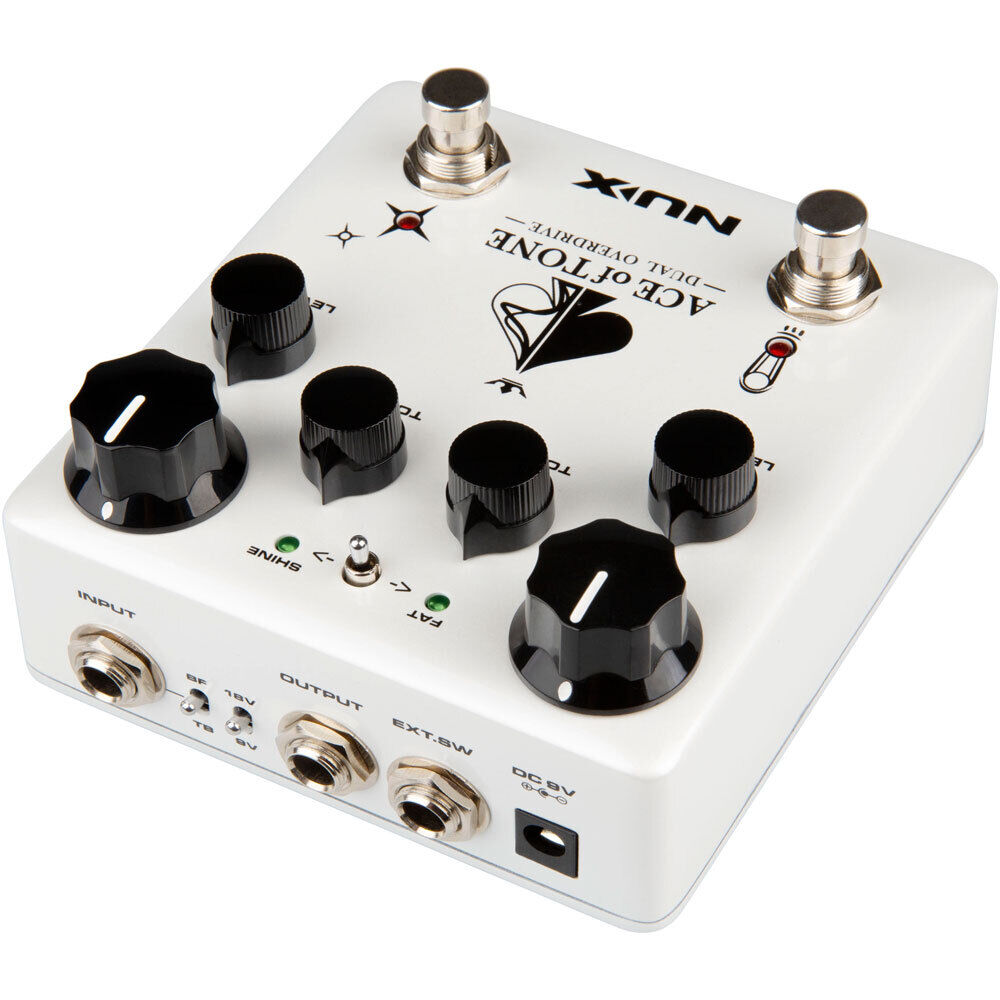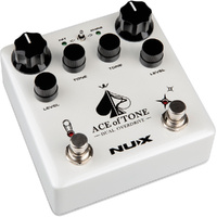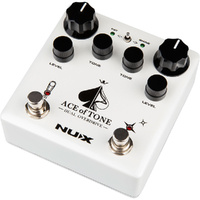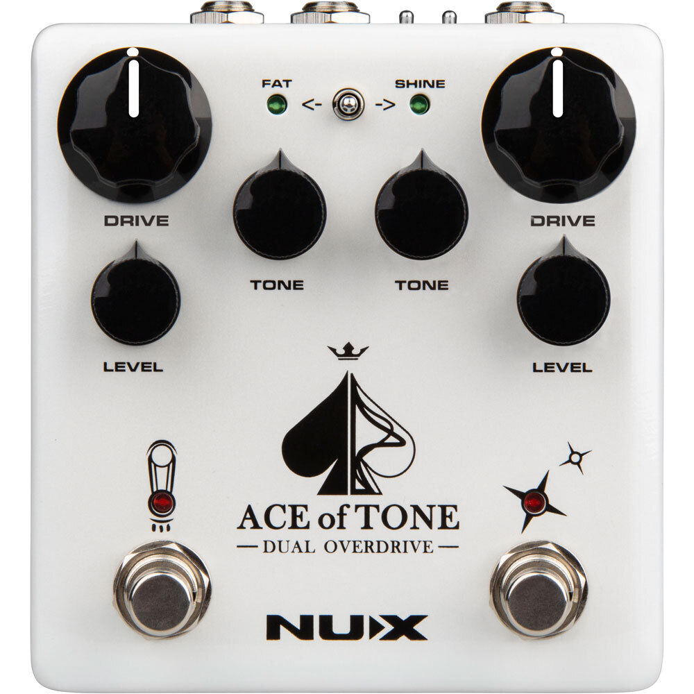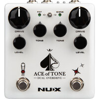 ACE of TONE is a dual overdrive pedal stacked with Tubeman MKII and Morning Star. Why? Because great guitarists love 2 overdrives to stack their tone. In the left corner, Tubeman with FAT mode. Tubeman offers way more clarity and gain than any classic Tubescreamer, and we modified the circuit with a useful secondary function by simply holding the foot switch - FAT mode. It cranks way more bass response to enhance the low-end yet makes the tone warmer! In the right corner, Morning Star with SHINE mode. Morning Star is based on legendary Bluesbreaker circuit: very transparent, low gain drive. Like our Morning Star, it also features a simple FOOT SWITCH HOLD to engage the iconic SHINE mode. In SHINE mode, you can get way more treble sound to make your tone crystal-clear. Specifications: Input Impedance: 2.2M ohms Output Impedance: 1K-ohms Power: 9V DC (Negative tip,Optional ACD-006A adapter) Current Draw: Less than 100mA Dimensions: 105mm (L) x 115mm (W) x 58mm (H) Weight: 440g Control Panel Left Side (Tubeman) DRIVE Knob: Controls the gain of Tubeman circuit. TONE Knob: Controls the treble frequency of Tubeman circuit. LEVEL Knob: Controls the volume of Tubeman circuit. Footswitch: Engage/Disengage Tubeman circuit. Hold it for 1 second, you can turn on/off FAT mode. FAT Indicator: While you engaged FAT mode, the indicator will turn on. Right Side (Morning Star) DRIVE Knob: Controls the gain of Morning Star circuit. TONE Knob: Controls the treble frequency of Morning Star circuit. LEVEL Knob: Controls the volume of Morning Star circuit. Footswitch: Engage/disengage Morning Star circuit. Hold it for 1 second, you can turn on/off SHINE mode. SHINE Indicator: While you engaged SHINE mode, the indicator will turn on. Routing Toggle Switch: You can adjust the order from Morning Star to Tubeman or Tubeman to Morning Star. It's very useful to stack the sound. Inputs / Outputs Input: Connect your guitar side to INPUT jack. Output: Connect the OUTPUT signal to amp side. EXT. SW: You can use external foot controller (like NUX NMP-2) to remote this pedal. BF / TB Toggle Switch: BF means Buffer-Bypass, TB means True-Bypass. You can choose BF while you connect with several pedals in your signal chain to solve tone-loss situation. 18V/9V Toggle Switch: ACE of TONE can double the voltage internally while you toggle to 18V position, that can increase dynamic range and headroom. DC Jack Use ONLY: 9V Negative Tip power with 100mA.
