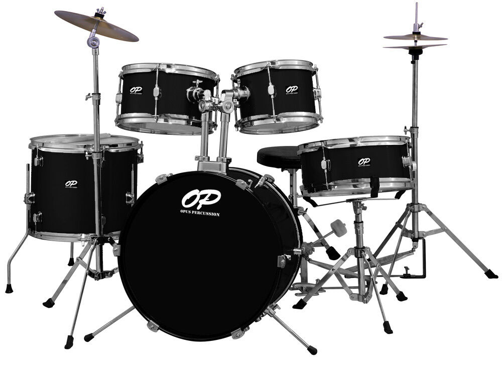 Opus Percussion 5-Piece Junior Drum Kit with Hardware and Cymbals. Features: Black Wrap finish All chrome colour hardware on drums Poplar Plywood Drum Shells Stands included: Hi-Hat Stand, Straight Cymbal Stand, Snare Stand Cymbals included: 8" Hi-Hats &
