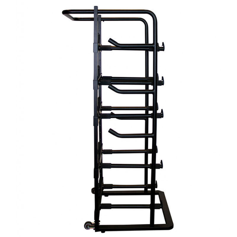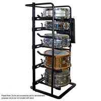 Securely store up to five snare drums and create an attractive drum display with our DRS9000 Snare Drum Rack. Five pairs of support arms made of heavy-duty steel each hold up 18 lb to ensure reliable equipment support. The horizontal space between the support arms adjusts to safely hold any size drum up to 16" in diameter. The vertical space between the crossbars adjusts to fit various snare heights to accommodate a wide range of drum combinations. Squeeze-to-release handles enable efficient positioning of the support arms, making easy to add new drums or change the order of an existing drum collection. Unused crossbars and support arms can be removed for a clean, organized look and reattached as needed. Rubber sleeves and end caps on each support arm protect drum finishes and stabilize the drums to prevent rattling and ringing. Two smooth-rolling casters and a handlebar provide handcart-style mobility for ease of relocating the rack. Features: Securely stores and provides convenient access to five snare drums Space between support arms adjusts from 3" to 16" to safely fit any size snare up to 16" in diameter 22 height adjustment slots enable many configurations to accommodate a wide range of snare collections Vertical drum orientation ensures drums are quiet when not in use Rubber sleeves and end caps on the support arms stabilize drums to prevent ringing and rattling Support arms and crossbars are removable for a clean look regardless of the number of drums on display Casters and a handlebar provide handcart-style mobility for ease of relocating the rack Specifications: Rack Dimensions: 50.5" (H) x 21.25" (W) x 23" (D) Base Dimensions: 18" x 21.25" Tubing Diameter: 25mm Weight Capacity Per Crossbar with Support Arms: 18lb Total Weight Capacity: 100lbs (90 combined on the crossbars plus 10 lb on the frame for hanging accessories) Crossbar Height Adjustment Slots: 22 Support Arm Width Adjustment: 3" - 16" Max Drum Size: Fits drums up to 16" in diameter