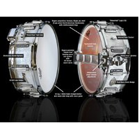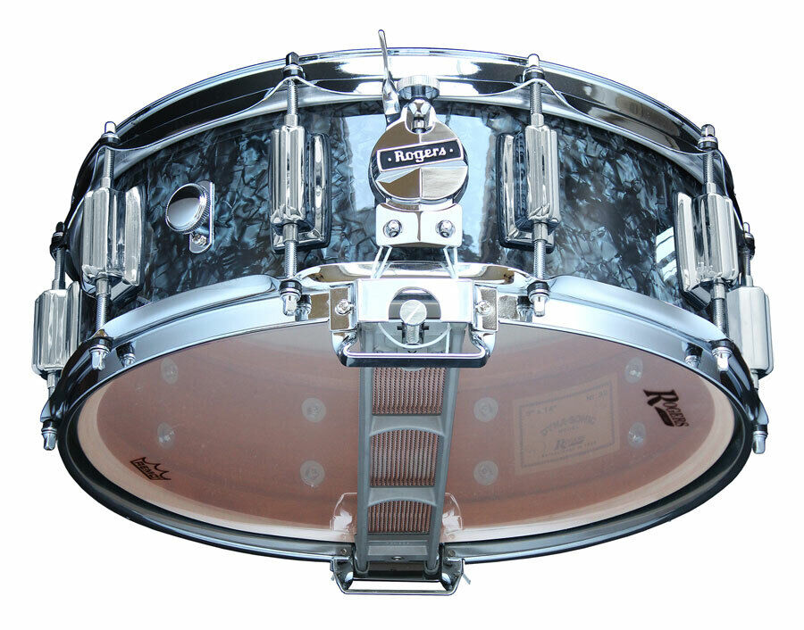 Rogers Beavertail Snare Drum in Black Diamond Pearl - Model No. 36BP is cool, dark and handsome. Black Diamond Pearl, a consistent fave among Rogers' fans, is now available in the Rogers' famous wood-shell Beavertail Dyna-Sonic Series. Featuring a 5" x 14" standard depth, proprietary formula shell complete with original spec reinforcement rings. Faithfully appointed with the second generation lug profile, chrome script logo, oval badge and finished in stunning Black Diamond Pearl. At the heart of the drum is Rogers legendary floating snare rail system, which provides extraordinary sensitivity and control that has never been duplicated. Hand-built in Roger's USA workshop, the Dyna-Sonic No. 36-BP is another masterpiece of art and sonic excellence. Specifications: 5" x 14" Standard trap kit depth, wood shell Shell: Proprietary formula 5-ply Maple/ Poplar with reinforcement rings Hoops: 10 lug, 1.6mm triple flanged batter and snare side hoop with snare gates Lugs: Beavertail double sided die-cast lugs (10) Throw off: Swivo-matic (Clock Face) style strainer Butt end: Clock face matching butt end Snares: Exclusive floating snare rail system with adjustable 20-strand snare wires Badges: Rogers script logo badge, Dyna-Sonic "Custom Built " oval badge Shell Finish: Black Diamond Pearl wrap Interior finish: Fruitwood stain What makes the Dyna-Sonic difference? Pinpoint Definition - You hear the result of each stroke, even at full power always without distortion. Choke-Free Sound - Always clear and crisp, never mushy. Faster Stick Rebound - You get added speed and better feel with half the effort Your drum head feels solid, never soft. Full Dynamic Range - Everywhere on the head There are no dead spots, even at the edges. The Sound - This drum has true musical sound. The tone quality is built in by the unique combination of the floating snares, head, and custom shell Simplest Adjustment - Of any drum, a single tension screw gives you one-point uniform tensioning. Set it, and forget it. THIS is the drum that "couldn't be built" This is the drum that solved a problem that "couldn't be solved" Before Dyna-Sonic, you tightened the snares, and the snares choked the head. Dyna-Sonic changes all that. Because your snares ride on an exclusive floating snare frame. They ride with the snare head, never dampen it. There's no choking. There's never and snare slap. With a traditional snare drum, choking results from snare wires being pulled up too tight from the strainer knob when trying to dial out snare vibration and dry up or "crisp" up the sound. With the Dyna-Sonic snare frame, the concept is to allow the snare tension to be controlled on the frame itself, while the strainer knob simply brings the frame up to just "kiss" the bottom head. This results is superior sensitivity over the entire head and allows for all snare adjustment, from "dry" to "loose" to be controlled from the frame itself. Roger's product designer, Joe Thompson said it best in his Jan 16, 1962 patent application for the Dyna-Sonic snare rail system: "The goal of this invention is to provide a drum with 'floating snares', which can be tensioned without putting pressure on the head, on a drum with no snare beds." The Dyna-Sonic snare frame is that same exclusive floating snare frame design. Made of cast steel, the frame comes complete with snare wire mounted. The single tension screw located at the end of the frame, gives one-point uniformed tensioning with simple hand adjustment. Set it, and it remains in the desired position. Experience the Dyna-Sonic difference - proudly brought to you by Rogers USA. Rogers History Timeline 1849 Joseph H. Rogers establishes USA's first calfskin head company in Brewster's Station, New York, followed later by a second tannery in Farmingdale, New Jersey, operated by son Joseph H. Rogers Junior. 1930 In addition to drum and banjo head production, grandson Cleveland S. Rogers begins to manufacturer the first "Rogers" drums at the Farmingdale tannery. 1955 Cleveland S. Rogers sells the Rogers company to distributor Henry Grossman. Subsequently, Grossman moves Joseph Rogers Inc. from Farmingdale to Covington, Ohio. 1956 With the combined skills of Henry Grossman, inventor Joe Thompson, and marketing manager Ben Strauss, the Rogers Company rises to become a leading innovator in drum & percussion manufacturing at the Covington plant. 1966 - 2006 After an inspired decade at the company's Covington facility (considered the "Golden Era" of the Rogers brand), the company's assets are subsequently sold to a series of musical instrument corporations including CBS (1966), Brook Mays (1999), and Yamaha (2006). 2017 Rogers returns"¦