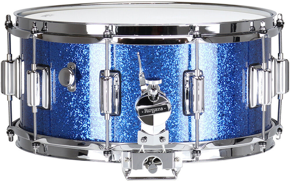 Rogers Dyna-Sonic Limited Edition Custom Lacquer Series snare drums. These special production run drums are now available in high-luster Black Gloss lacquer, Gold Sparkle lacquer, Blue Sparkle lacquer & Red Sparkle lacquer finishes. Long celebrated for its luminosity and depth, high-gloss lacquer drum finishes provide a robust and seamless shell that is visually stunning. Offered in both 5" x 14" standard and 6.5" x 14" concert shell depths. Hand-built in Roger's USA workshop, the Dyna-Sonic Limited Edition Custom Lacquer series is another masterpiece of art and sonic excellence. Don't wait - available only for a limited time... Featuring a 6.5" x 14" standard depth, proprietary formula shell complete with original spec reinforcement rings. Faithfully appointed with the second generation lug profile, chrome script logo, oval badge and finished in stunning blue sparkle lacquer. At the heart of the drum is Rogers legendary floating snare rail system, which provides extraordinary sensitivity and control that has never been duplicated. Hand-built in Roger's USA workshop, the Dyna-Sonic No. 37-BSL is another masterpiece of art and sonic excellence. Specifications: 6.5" x 14" Standard trap kit depth, wood shell Shell: Proprietary formula 5-ply Maple/ Poplar with reinforcement rings Hoops: 10 lug, 1.6mm triple flanged batter and snare side hoop with snare gates Lugs: Beavertail double sided die-cast lugs (10) Throw off: Swivo-matic (Clock Face) style strainer Butt end: Clock face matching butt end Snares: Exclusive floating snare rail system with adjustable 20-strand snare wires Badges: Rogers script logo badge, Dyna-Sonic "Custom Built " oval badge Shell Finish: Blue Sparkle Lacquer Interior finish: Fruitwood stain What makes the Dyna-Sonic difference? Pinpoint Definition - You hear the result of each stroke, even at full power always without distortion. Choke-Free Sound - Always clear and crisp, never mushy. Faster Stick Rebound - You get added speed and better feel with half the effort Your drum head feels solid, never soft. Full Dynamic Range - Everywhere on the head There are no dead spots, even at the edges. The Sound - This drum has true musical sound. The tone quality is built in by the unique combination of the floating snares, head, and custom shell Simplest Adjustment - Of any drum, a single tension screw gives you one-point uniform tensioning. Set it, and forget it. THIS is the drum that "couldn't be built". This is the drum that solved a problem that "couldn't be solved". Before Dyna-Sonic, you tightened the snares, and the snares choked the head. Dyna-Sonic changes all that. Because your snares ride on an exclusive floating snare frame. They ride with the snare head, never dampen it. There's no choking. There's never and snare slap. With a traditional snare drum, choking results from snare wires being pulled up too tight from the strainer knob when trying to dial out snare vibration and dry up or "crisp" up the sound. With the Dyna-Sonic snare frame, the concept is to allow the snare tension to be controlled on the frame itself, while the strainer knob simply brings the frame up to just "kiss" the bottom head. This results is superior sensitivity over the entire head and allows for all snare adjustment, from "dry" to "loose", to be controlled from the frame itself. Roger's product designer, Joe Thompson said it best in his Jan 16, 1962 patent application for the Dyna-Sonic snare rail system: "The goal of this invention is to provide a drum with 'floating snares', which can be tensioned without putting pressure on the head, on a drum with no snare beds." The Dyna-Sonic snare frame is that same exclusive floating snare frame design. Made of cast steel, the frame comes complete with snare wire mounted. The single tension screw located at the end of the frame, gives one-point uniformed tensioning with simple hand adjustment. Set it, and it remains in the desired position. Experience the Dyna-Sonic difference - proudly brought to you by Rogers USA. Rogers History Timeline 1849 Joseph H. Rogers establishes USA's first calfskin head company in Brewster's Station, New York, followed later by a second tannery in Farmingdale, New Jersey, operated by son Joseph H. Rogers Junior. 1930 In addition to drum and banjo head production, grandson Cleveland S. Rogers begins to manufacturer the first "Rogers" drums at the Farmingdale tannery. 1955 Cleveland S. Rogers sells the Rogers company to distributor Henry Grossman. Subsequently, Grossman moves Joseph Rogers Inc. from Farmingdale to Covington, Ohio. 1956 With the combined skills of Henry Grossman, inventor Joe Thompson, and marketing manager Ben Strauss, the Rogers Company rises to become a leading innovator in drum & percussion manufacturing at the Covington plant. 1966 - 2006 After an inspired decade at the company's Covington facility (considered the "Golden Era" of the Rogers brand), the company's assets are subsequently sold to a series of musical instrument corporations including CBS (1966), Brook Mays (1999), and Yamaha (2006). 2017 Rogers returns"¦