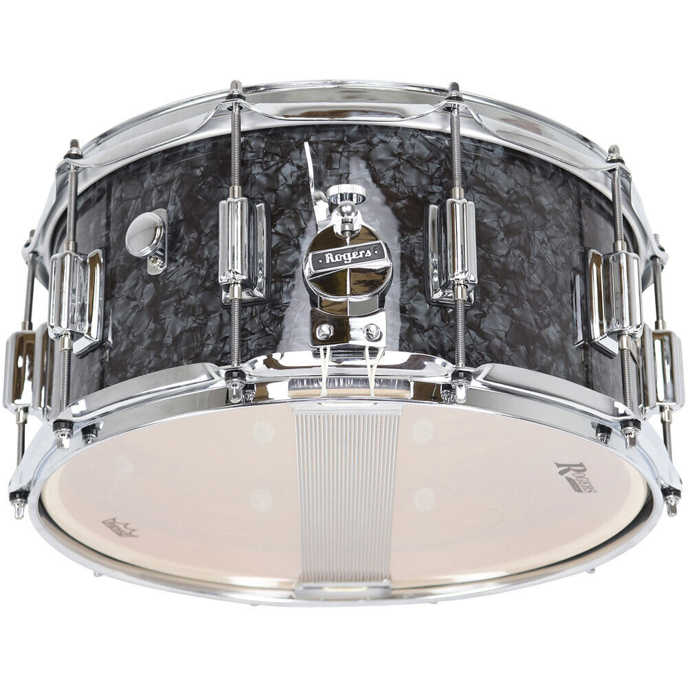 In the tradition of innovation and sound that belongs to the Rogers' family of drums, the long celebrated SuperTen returns to the roster of legendary Rogers snare drums. This extraordinary drum's roots can be traced to the Dyna-Sonic bloodline of the Rogers family tree. SPECIFICATIONS: Model No: 37-BP Finish: Black Pearl Size: 14 x 6.5" Shell: 5-ply Maple-Poplar with 2-ply reinforcement rings Hoops: 2.3mm triple flanged, 10 lug Lugs: Beavertail die-cast lugs (10) Throw-off: Clock Face Badge: SuperTen Heads: Remo USA Batter / UT Snare Side What is a SuperTen? The SuperTen snare drum features Rogers' top tier snare drum components and preeminent shell design. Built with a precision ten-lug profile for optimum tuning range and focus of sound, the SuperTen delivers a powerful backbeat with unlimited dynamics in volume and tone. Wood models feature our own proprietary design of a 3-ply shell of 2mm thick plies of maple and poplar, along with 2-ply reinforcement rings. Each shell interior is hand finished in our exclusive Fruitwood stain. This USA hand built shell delivers warmth and tone that projects in any musical setting, and has a dynamic range that works from the softest of brush patterns to the heaviest of back beats. Wood shell models are available in 5" x 14" (ST36) and 6.5" x 14" (ST37) offered in the classic colors White Marine Pearl, Black Pearl, Red Onyx, Blue Onyx, Blue Sparkle Lacquer (Limited quantities) and Red Sparkle Lacquer (Limited quantities). Clock Face Throw Off The Rogers Clock Face Throw Off offers a simple yet exacting way to dial in the right amount of snare wire sensitivity with the simple turn of a thumbscrew. From "loose and fuzzy" to "crisp and focused" this strainer offers simplicity of function, as well as precision and confidence in your desired adjustment. The user-friendly throw off arm is conveniently located just behind the thumbscrew for easy on-off adjustment. Hoops Today's drummers will appreciate the 2.3mm chrome plated hoops that are featured on all SuperTen models. These bring a modern focus in tone, accurate tuning, cutting rim shots and woody cross stick tones. Beavertail Lugs Rogers' Beavertail lugs are featured on all SuperTen models in a ten-lug design for accurate tuning, focus in tone and classic Rogers style. Internal Tone Control For a quick change in tone and resonance, the internal tone control can be brought in or out at the turn of a dial. Drummers can make easy changes in resonance and tone without adding or removing gels or muffle rings from the batter side of the drumhead. SuperTen snare drums are the ally of today's versatile drummer. These USA hand built brass models offer versatility and superior tone in a variety of sizes that will fit any musical situation. Your imagination is the only limitation with where the SuperTen Snare drums will take you. This all- around USA hand built snare drum is cast from Rogers' own blueprint from the Golden Age of snare drum design, and will satisfy Rogers hardcore vintage enthusiasts and introduce today's generation of drummers to the true Rogers experience.