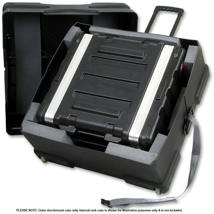 Internal shock-absorbing transport box with wheels and pull-out handle. For shockproof transport of a 4U rack. Internal dimensions: 55 x 55 x 21.6 cm.