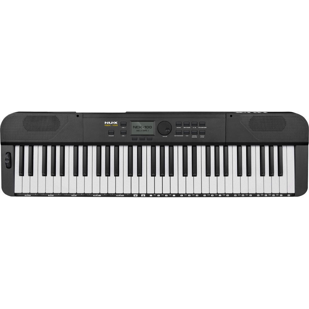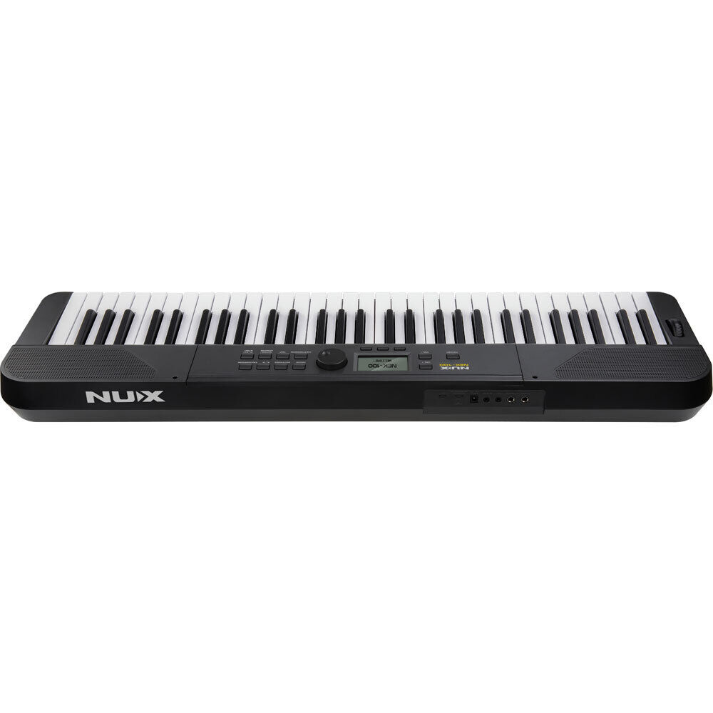 NEK-100 brings together the advanced technology of NU-X to produce a comprehensive and convenient keyboard for stage, outdoors and home. Powered from its internal rechargeable battery or the included 12V adaptor, this instrument is compact and lightweight, whilst offering a multitude of sounds, styles, effects and accompaniment options. An additional Live Music mode offers 20 flavours of music and various effects. Control layout is simple and intuitive, providing quick access to all functions, with options for transpose, split or layered keyboard, touch response, pitch bend, and Bluetooth connections. The NUX NEK-100 hides a full arsenal of player options in a very portable and convenient package. SPECIFICATIONS: Keyboard: 61 Keys Touch Response: Light2, Light1, Normal, Hard1, Hard2 Sounds: 500 Max. Polyphony: 54 Effects & Functions: Reverb (3 types), Dual Voice, Split Keyboard, Transpose (-12 to 0 to +12 semitones), Octave Shift (-1 to 0 to +1 octave), A4 Tuning (420-460Hz), 5 User Presets Auto Accompaniment: 100 Styles (Auto Chord, Single/Multi Fingering, Sync Start, A/B Variations, Intro/Ending) Metronome: 1-9 Beats, 4 Voices, 40-240 BPM Tempo Range, Tap Tempo Pitch Bend Wheel: +2 semitones Live Music Function: 20 Live Music Songs Demo Songs: 100 Display: TFT LCD 128X64dpi Connectivity: 3.5mm Stereo Phones Out, 6.35mm Stereo Aux Out, 3.5mm Stereo Aux In, Sustain Pedal Jack, USB MIDl, Bluetooth Audio & Bluetooth MIDI Speakers: 2.2" x 4.9" x (2), 5W x (2) Power Supply: 3000mAh Rechargeable Battery, or DC 12V 2A Center-Positive Power Adaptor Weight: 3.1kg Dimensions (L x W x H): 925mm x 252mm x 80mm Included Accessories: Power Adaptor, Music Rest, User Manual, NBT-1 Bluetooth Module Large-Capacity Rechargeable Battery, Perfect for Outdoor Performances When performing outdoor or having a party, the NEK-100 will bring you more than expected. The built-in 3000mAh rechargeable battery can work continuously for more than 10 hours even at high volume, and you can charge it while playing, eliminating thehassle of replacing AA batteries. The keyboard weighs only 3.1KG (less than 7lbs), making it perfect for gigging on the go. Live Music Mode NEK-100's Live Music mode makes your performances more versatile and fun! Each of the 20 Live Music songs consists of 4 tracks with 3 phrase options each. You can combine different phrases freely, add bridges, use various effects, and toggled with normal patch sounds for standard right hand playing to make your live performance more expressive. Sounds and Playing Experiences for Different Styles Including the grand piano sound, the NEK-100 provides you with a total of 500 sounds to choose from. Use an organ, electronic piano, orchestra sound, or layer sounds to inspire your playing! NEK-100 features a full-size half-weighted keyboard with 5 touch response curves, as well as a pitch bend wheel, allowing you to accurately express the details of your performance. Auto Accompaniment Band NEK-100's auto accompaniment functions let you easily control the accompaniment band with your left hand. 100 internal demo songs and 100 rhythm styles are available to play along to, covering pop, jazz, rock, dance music, etc. You can also switch to single fingering mode to trigger the chords more easily. Simple Connections and Versatile Functions USB-C MIDI connection appoints the NEK-100 as a controller within a DAW software studio, and a further USB-C is provided for the included NBT-1 Bluetooth adaptor (Audio and MIDI). Sustain pedal input, aux in, headphones out and line output complete the connection panel at the rear. NEK-100 offers 3 types of Reverb, and has rich functions such as Dual Voice, Split Keyboard, Octave Shift, etc. You can also save your own presets to the 5 User Preset slots, making every performance more customized and convenient. Chic, Contemporary, Convenient The NEK-100 can perfectly fit into contemporary living spaces and is also excellent for outdoor performances. When playing at home, you can place it wherever you want. Just lie on the sofa and enjoy your own music! ** Free Firmware Updates and Manuals are available by clicking here then selecting "Support"