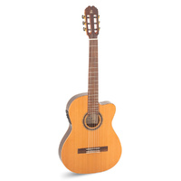 Scale: 650mm Top: Solid cedar Sides & Back: Ovangkol Neck: Mahogany Fingerboard: Kabukali Machines Heads: Gold-plated lyre with black buttons Strings: Spanish Finish: Gloss Body: Thin – slim profile Pickup/Preamp: Fishman Clasica III Cutaway: Yes
