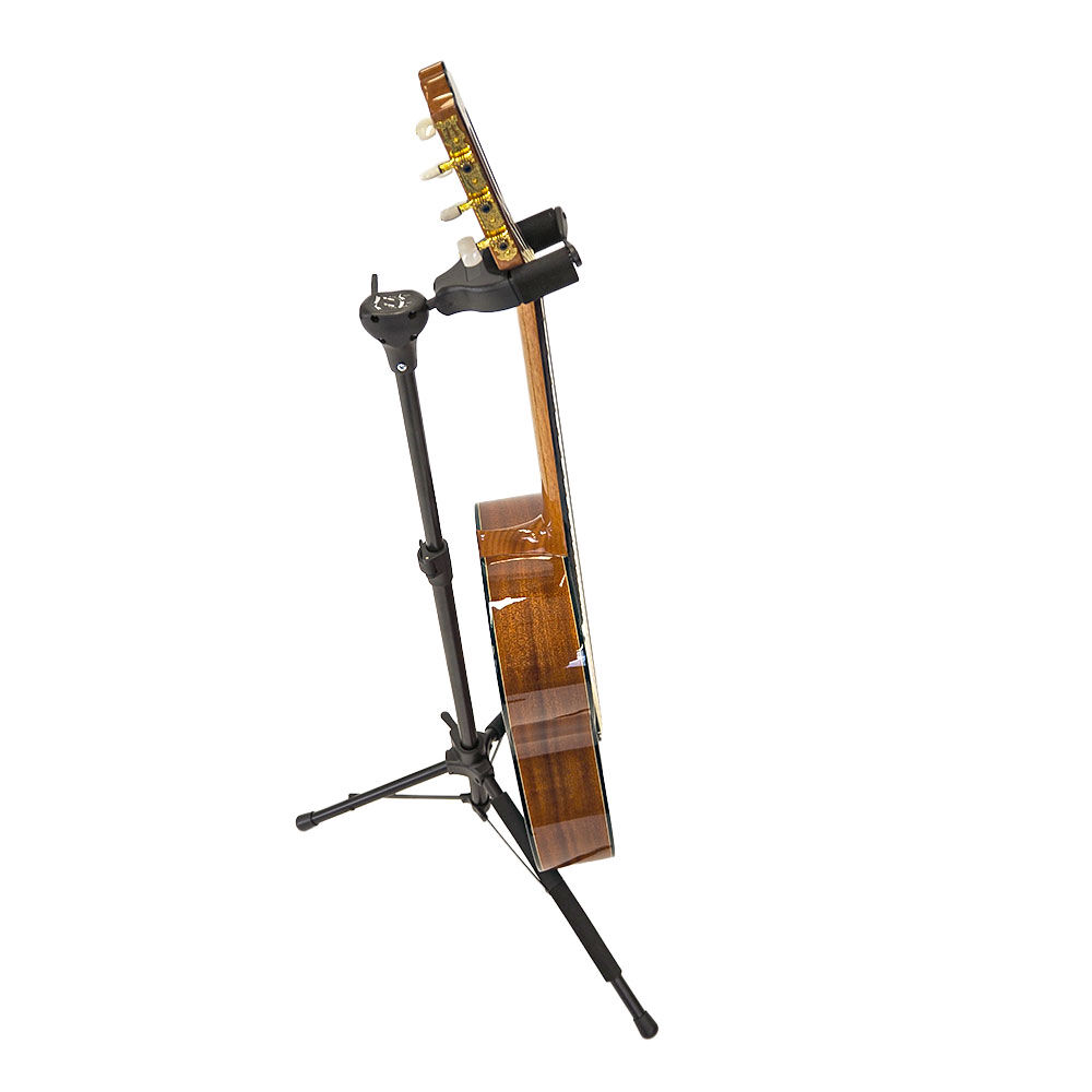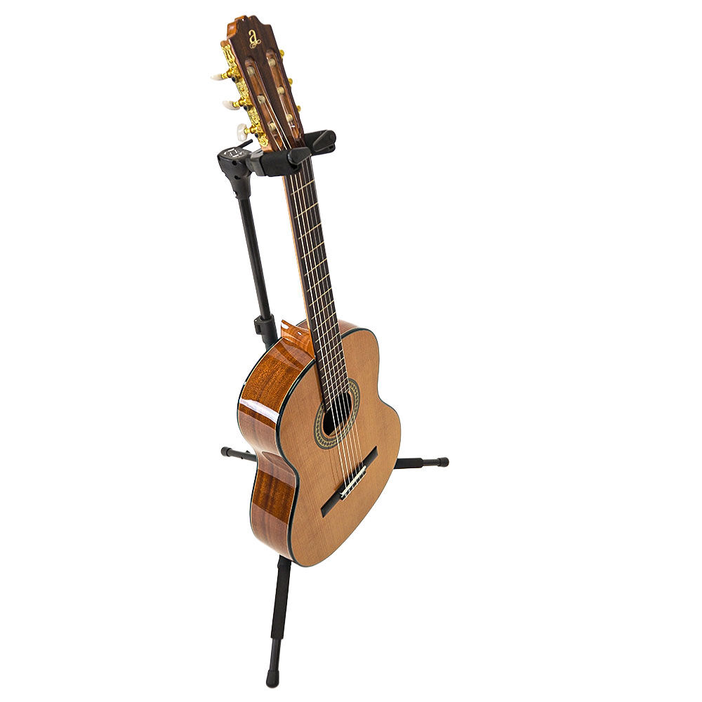 The Beam Accessories guitar stand has an automatic-grip mechanism that grasps the instrument around the neck, below the headstock, locking it securely in place. The mechanism unlocks as the instrument is lifted upward. Suitable for electric, acoustic and