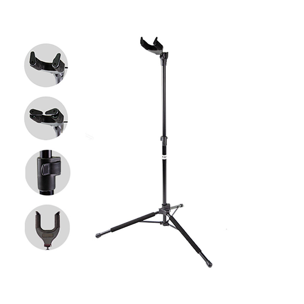 The Beam Accessories guitar stand has an automatic-grip mechanism that grasps the instrument around the neck, below the headstock, locking it securely in place. The mechanism unlocks as the instrument is lifted upward. Suitable for electric, acoustic and bass guitars. The stand has three retractable legs and height adjustment. The legs and grip mechanism fold flat against the body of the stand for easy transportation. The contact points are made from soft foam EVA (Ethylene Vinyl Acetate) deemed to be friendly to standard instrument finishes.