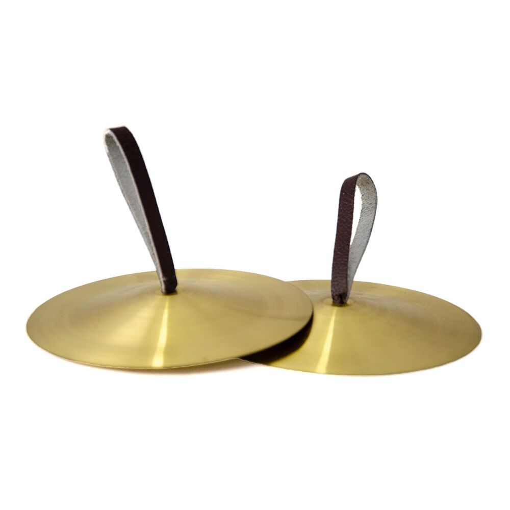 Century Percussion Cymbals 5″ Brass pair, with brown leather straps.