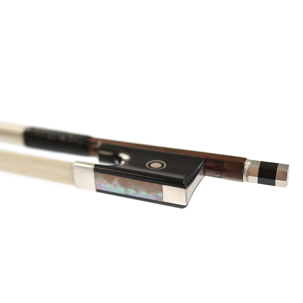 French model bow with pernambuco stick and ebony frog with silver ferrule and heelplate. Supplied in a heavy duty bow box.