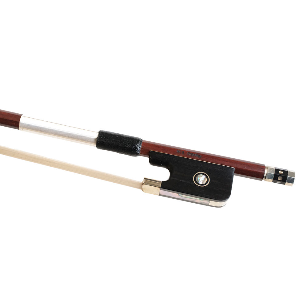 “Dorfler” Pernambuco Octagonal Viola Bow. Fine pernambuco octagonal stick, full German silver mounted ebony frog, pearl slide, Parisian eye, three part screw with pearl eye, nickel-silver wire winding and leather grip. Made in Germany.