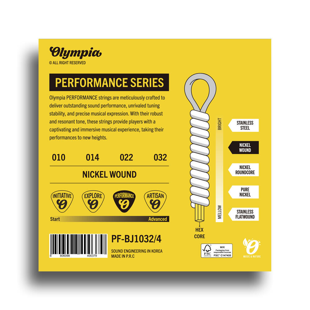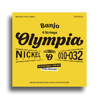 Olympia PERFORMANCE strings are meticulously crafted to deliver outstanding sound performance, unrivaled tuning stability and precise musical expression. With their robust and resonant tone, these strings provide players with a captivating and immersive musical experience, taking their performances to new heights. SPECIFICATIONS: Type: Banjo Strings Series: Performance Series Gauge: (Custom Light) 010 - 014 - 022 - 032 Package: 4-Strings Scale Length: Standard Scale Core Material: Tin-Plated High Carbon Steel Core Construction: Hexagonal Wrap Material: Nickel-Plated Steel Wrap Construction: Round Wound
