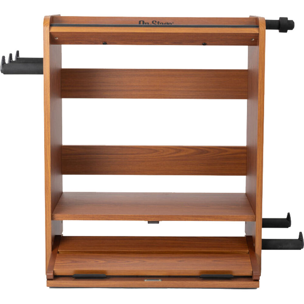 Keep all your guitar gear safely organized, on display, and ready to play with the GWS5000B Guitar Workstation. This multipurpose workstation is a combination amp stand, guitar stand, cable and strap hanger, pedalboard, and accessory tray rolled into one convenient and visually appealing package. At the center, a wide-open shelf provides plenty of space for a powerful combo amp as large as a Deluxe Reverb or AC15. The shelf elevates your amp for improved sound quality, directing its speaker closer to your ears, decoupling the cabinet from building surfaces that absorb or boost certain frequencies, and reducing sound-wave reflections off the floor. The pedalboard at the bottom holds several guitar-effect pedals and, at 8 inches wide, accommodates a variety of stompbox sizes. An opening down the center of the board makes it easy to route your wires and cables for a clean and practical layout. Hook-and-loop strips are included for securing your devices to the shelves, a popular attachment method that enables ease of rearrangement if you decide to make changes to your setup. When it's time to play, the pedalboard completely slides out of the workstation and can be positioned as close to or as far away from your amp as you choose. When you're finished playing you can slide the board back into the workstation and close the bottom door to shield your pedals from dust, debris, and mishaps. On the right side of the workstation, there's a guitar stand that holds a wide range of popular electric guitars and basses. Padding on the stand's bumpers provides traction to keep your instrument in place and also protects its finish from dings and scratches. Padded hangers on the left side provide storage for long supplies such as coiled cables and guitar straps. Your picks, capos, tuners, slides, and other accessories can be stored on the top shelf for easy access. The shelf is angled back and features a front bumper to keep small objects from falling or rolling away. It's even a good place to prop up your phone for watching lessons, recording videos, or reading music. The black finish looks great in living spaces and displays well in your livestream or studio setup to add to a professional presentation. On-Stage Patent Pending Design. FEATURES: Accommodates several of your effect pedals on a removable pedalboard. Enables you to hang up long supplies such as coiled cables and guitar straps. Encloses your pedals to protect them from dust, debris, and mishaps. Keeps all your electric guitar or bass gear safely organized, on display, and ready to play. Securely holds your electric guitar or bass and protects its finish from dings and scratches. Stores your picks, capos, tuners, slides, phones, and other small accessories for easy access. Sturdy stand elevates your combo amp for improved sound quality. SPECIFICATIONS: Amp Shelf Dimensions (L x W x D): 24.5" x 12.5" x 20.5" Amp Shelf Dimensions (L x W x D): 24.5" x 12.5" x 20.5" Cabinet Construction: MDF Finish: Rosewood Includes: Hook-and-loop strips Pedalboard Dimensions (L x W x D): 24" x 8" x 3.5" Top Shelf Dimensions (L x W x D): 24.5" x 1.5" x 3" Weight Capacity: 36 kg (80 lbs)