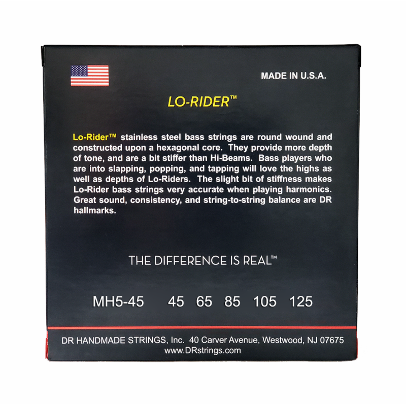 LO-RIDER Bass Strings are for players who are into slapping, popping and tapping. With a stainless-steel wrap wire on a hexagonal core, they deliver a combination of high end, depth and a bit of stiffness that makes harmonics very accurate. Great consistency and superior string-to-string balance are hallmarks of all DR strings, but LO-RIDER strings provides more depth of tone and are a bit stiffer than HI-BEAMS.