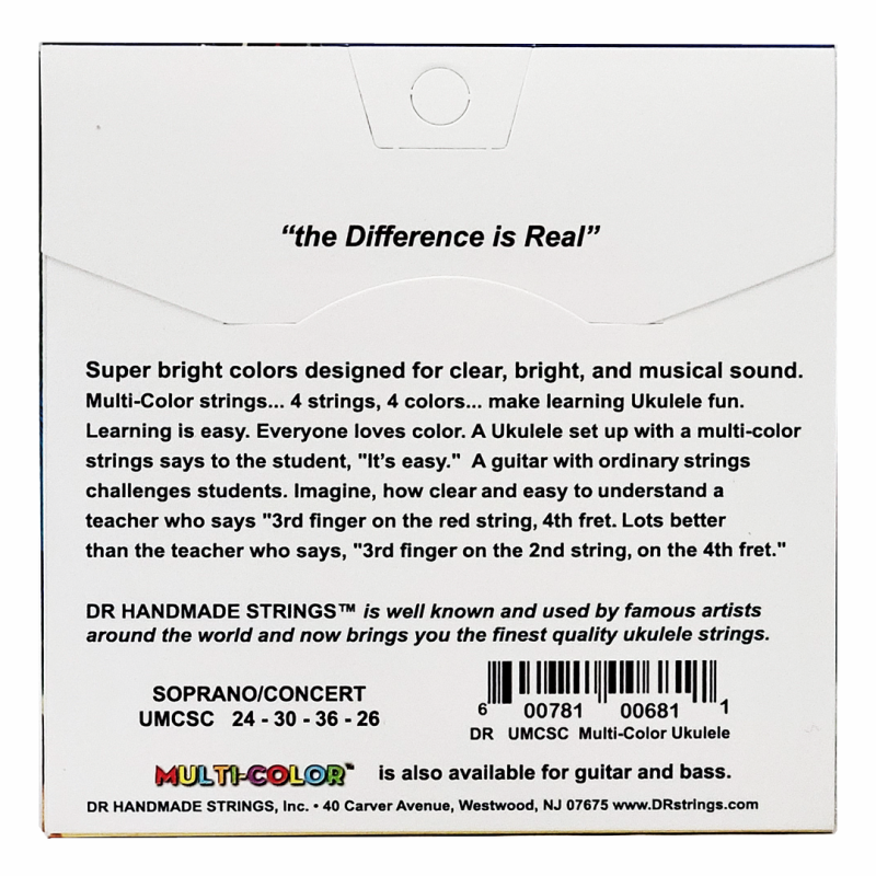 Super bright colors designed for clear, bright and musical sound. Multi-color strings... 4 strings, 4 colors... make learning Ukulele fun. Learning is easy. Everyone loves color. A Ukulele set up with a multi-color strings says to the student, It easy. A guitar with ordinary strings challenges students. Imagine, how clear and easy to understand a teacher who says 3rd finger on the 2nd string, on the 4th fret.