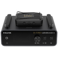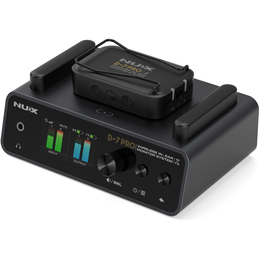 The NUX B-7 PRO is a personal wireless in-ear monitor system with automatic setup, 2.4 GHz interference-free broadcasting frequency, and 24-bit 48 kHz high-quality stereo audio. The operation range is up to 50 meters (160-feet) with very low latency wireless transmitting. SPECIFICATIONS: Operating Frequency Band: 2400-2483.5MHz Transmit Mode: Frequency Hopping RF Output Power: 10mW E.l.R.P. max Audio Quality: 24bit/48kHz Frequency Response: 20Hz-20kHz Latency: 7.33ms (low latency setting) 10.85ms (default) 14.33ms (safe setting) Unbalanced Input lmpedance: 10kΩ Balanced Input lmpedance: 20kΩ AUX Input Level: 2.1 Vrms (8.7dBu) max Balanced Input Level: 9.8 Vrms (22dBu) max Headphone output Impedance: Minimum 13Ω Headphone Maximum output power per channel: 57mW (THD<0.1% RLOAD=16Ω,1kHz) Channel separation: -105dB - THD+N: <0.01% typical Dynamic Range: 110dB A-weighted Output level Adjustment Range: Mute -86dB~+12dB Auto-0ff: It automatically turns off after 10 minutes of no connection or if the connection is lost Built-in Battery Capacity: Rechargeable Li-polymer (Transmitter 3.7V/3000mAh, receiver 3.7V/400mAh) Battery Lifetime: TX (Transmitter): Up to 6 hours/ RX: Up to 6 hours Power Requirements: DC 9V, 1A min, negative tip power supplies (Transmitter) Operation Range: Up to 50m (165 feet) maximum TX (Transmitter) Dimensions (L x W x H): 140 x 97 x 53mm TX (Transmitter) Weight: 525g RX (Receiver) Dimensions (L x W x H): 47 x 71 x 22mm RX (Receiver) Weight: 51g High Quality Stereo Audio Monitor B-7 PRO personal wireless in-ear monitor system delivers stereo audio signal on 2.4 GHz frequency range. That's a global interference-free broadcasting range you can use everywhere without a signal break. With the 24-bit 48 kHz audio quality you will never experience unwanted sound degradation. Automatic Setup and Friendly Matching The user-friendly matching system makes it easier to use, just turn on the TX & RX and they will be paired with each other within a couple of seconds. Each wireless set has a unique pairing algorithm, it automatically detects each other and configures their own IDs. High Definition Colour LCD Display B-7 PRO features a high definition colour LCD display. You can check the information very easily while performing on stage. Long Distance, Low Latency With the latest transmitting technologies, the B-7 PRO wireless system has the best performance for musicians. The latency is as low as 7.3ms when you set the transmitting at LOW LATENCY. The operation range is up to 50 meters (160-feet). Stable Mode for Anti-Interference To achieve the best performance, you can adjust the transmitting parameter between LOW LATENCY and STABLE. To avoid interference, please check if there is any Wi-Fi device around the TX&RX. It will be better for TX&RX to stay 0.8~1.0 meter away from any other 2.4GHz device to acheive the best performance. Performance & Comparison Long Battery Lifetime The B-7 PRO features large Li-ion batteries inside the TX & RX. The battery lifetime is as long as 6 hours. Easily Recharging You can easily put the RX on the top of the TX to recharge it. Super convenient for you to fully recharge it. Connections Here we listed devices you may connect to the B-7 PRO wireless system. USB Audio Recording Connect the B-7 PRO's TX (transmitter) to your cellphone or computer, you can use the B-7 PRO as a USB interface for recording. No matter what you play with a band on stage, you can record all sounds you hear form the monitor. Enjoy! Customize your own Boot-up Picture The B-7 PRO wireless system allows users to customize their own boot-up picture with a GIF. - Download the "B-7 PRO GIF Customizer" from the Support section from the link below on this webpage and install it. - Connect the B-7 PRO wireless system to your computer, and launch the "B-7 PRO GIF Customizer" - Disconnect and reboot the B-7 PRO wireless system, and then enter to the DISPLAY setting and set the BOOT-UP PICTURE option to USER. ** Free Firmware Updates and Manuals are available by clicking here then selecting "Support"