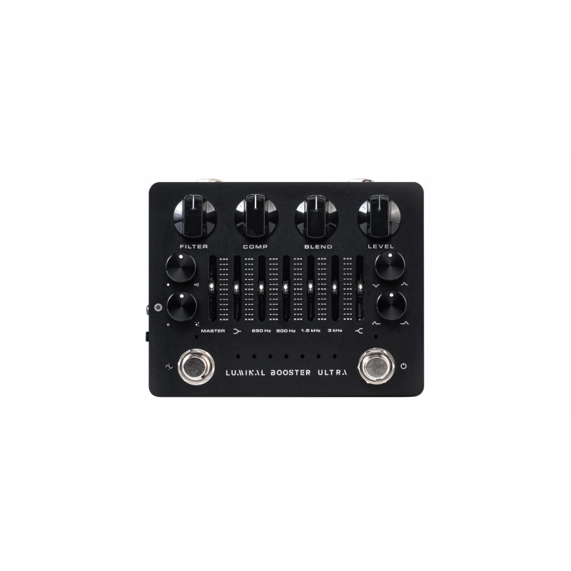 Combining the rich tone of the Harmonic Booster with the precision of an adjustable frequency range parallel compression, this pedal gives you unmatched control. With a 6-band EQ, gain reduction meter, and the option to load 7 custom Impulse Responses via USB, it delivers ultimate tonal flexibility for bass players of any genre. Pure, powerful, and precise—your clean tone, perfected. Front Features Filter Adjustable lowpass filter for the compressed signal Blend Blends between clean and compressed signal Comp Adjusts the amount of compression applied Level Adjusts the level of the compressor after the blend control Boost +-20dB boost or cut Character Allows blending in the perfect amount of the tone-shaping circuitry. Press to select between 7 IRs. Mid gain +-20dB @ the frequency selected by “Mid Frequency”. Mid Frequency Mid frequency from 250Hz to 2.5kHz. Master +-12 dB. Sets the overall volume of the unit. Bass Low shelf +-13dB @ 80 Hz Mid bands +-13dB @ 250 Hz, 500 Hz, 1.5 kHz, 3 kHz Treble High shelf +-13dB @ 5 kHz Dimensions Width: 125 mm / 5″ Length: 96 mm/ 3¾″ Height: 57 mm / 2¼″ Weight: 430 g / 0.95 lb The Luminal Booster Ultra has a current draw of 200mA. Only use a regulated 9V DC adapter with a center-negative plug. Unregulated power supplies and/or higher voltages may result in suboptimal noise performance and even damage your unit, voiding the warranty.