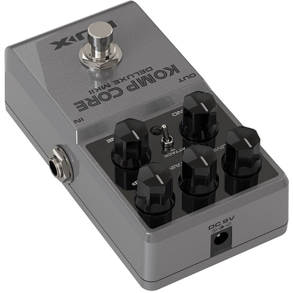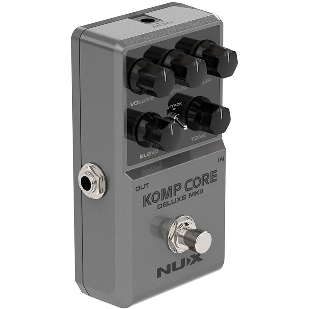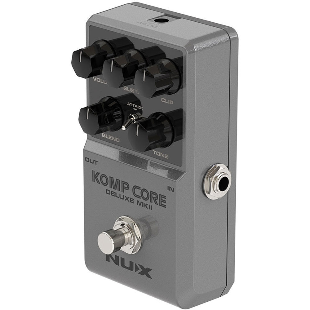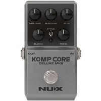 The NU-X Komp Core Deluxe MKII is a premium compressor pedal designed to deliver studio-grade compression in a compact stompbox format. Perfect for both live performances and studio recordings, it provides musicians with precise, natural dynamic control. Whether you're looking to preserve your instrument's natural tone or shape your sound with dynamic clarity, the KOMP CORE DELUXE MKII ensures every note is clean, balanced, and beautifully articulated. Features: 100% analog circuit. True bypass. Compressor designed for electric guitar and bass. Low power consumption. Blend knob for mixing dry and compressed signals. Clip knob for input gain control. Specifications Power: 9V DC (Negative tip, Optional ACD-006A adapter) Current Draw: 10mA Dimensions (L x W x H): 122 x 72 x 47mm Weight: 270g Studio-Grade Compressor Circuit The KOMP CORE DELUXE MKII preserves the transparency of your tone while enhancing clarity and balance, ensuring a natural, polished sound, all powered by a high-quality, pure analog circuit. Versatile Instrument Compatibility Whether you're playing guitar, bass, or keyboards, the KOMP CORE DELUXE MKII seamlessly adapts to various instruments, offering incredible versatility. Craft Your Unique Sound Five Knobs & Toggle Switch Design: With VOLUME, SUSTAIN, CLIP, BLEND, TONE, and ATTACK controls, the KOMP CORE DELUXE MKII offers comprehensive dynamic control and tonal shaping, allowing you to dial in the exact sound you desire. Sidechain Compression Function: The BLEND knob allows flexible dynamic control, giving you the ability to tailor the compression to your preferences, adding depth and texture to your performance. Connection The NU-X Komp Core Deluxe MKII is a groundbreaking pedal that redefines dynamic control and tonal precision. It integrates seamlessly with other effects pedals, enabling you to craft a harmonious, layered sound that enhances your performance. Whether on stage or in the studio, this pedal delivers exceptional clarity and transparency, quickly becoming an essential component of your rig. ** Free Firmware Updates and Manuals are available by clicking here then selecting "Support"