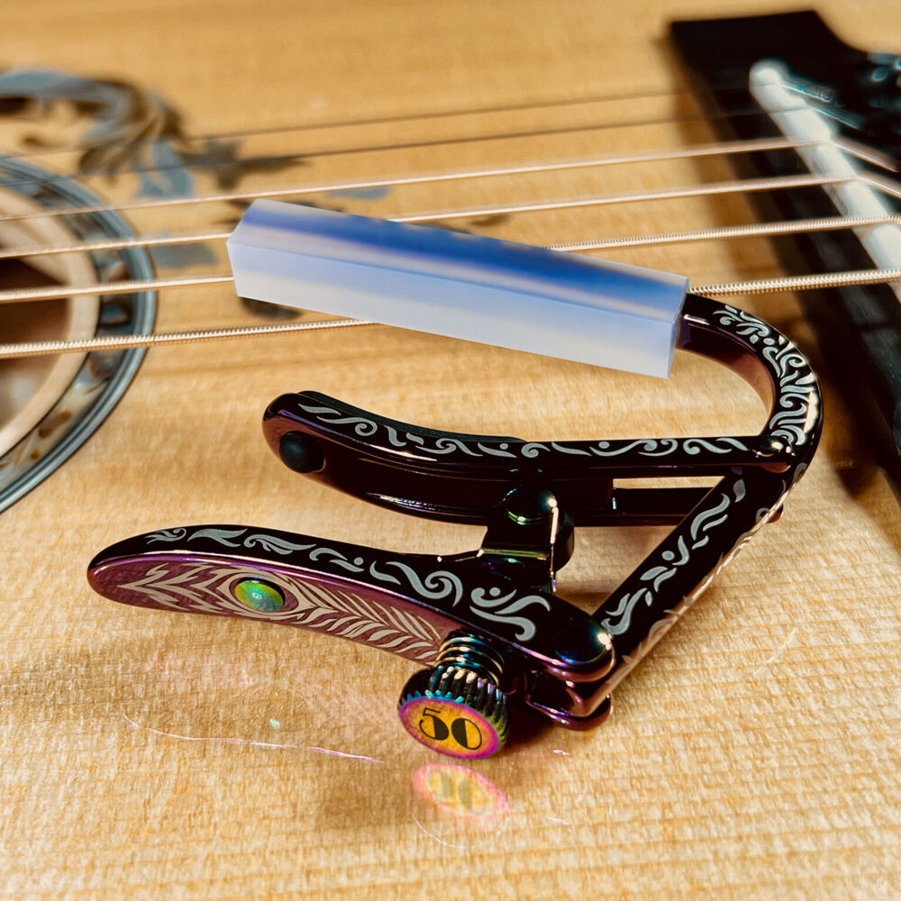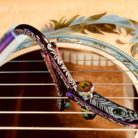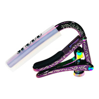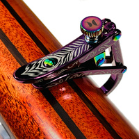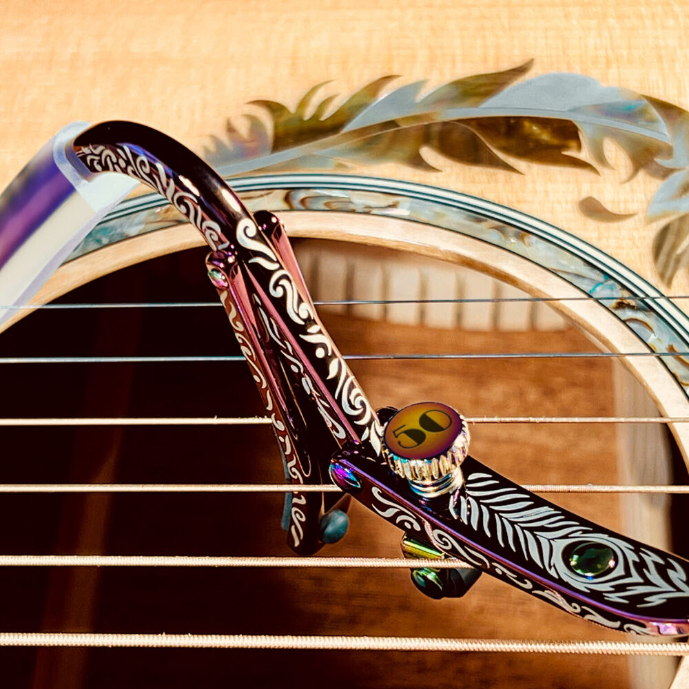 Introducing The Shubb limited 50th Anniversary Capo 2024 marked the 50th Anniversary of the Shubb Capo company which saw them release a series of very special capos; their Limited Anniversary Collection. They are a tribute to five decades of creativity by the artists who have made Shubb Capos the company it is today, and they represent the state of their art. These capos will be produced in limited quantities. The Violet Sky Capo features an elaborate pattern inspired by a redwood frond laser etched over a deep, rich violet background with iridescent, multicoloured fittings. Other models in the collection are available on special order.