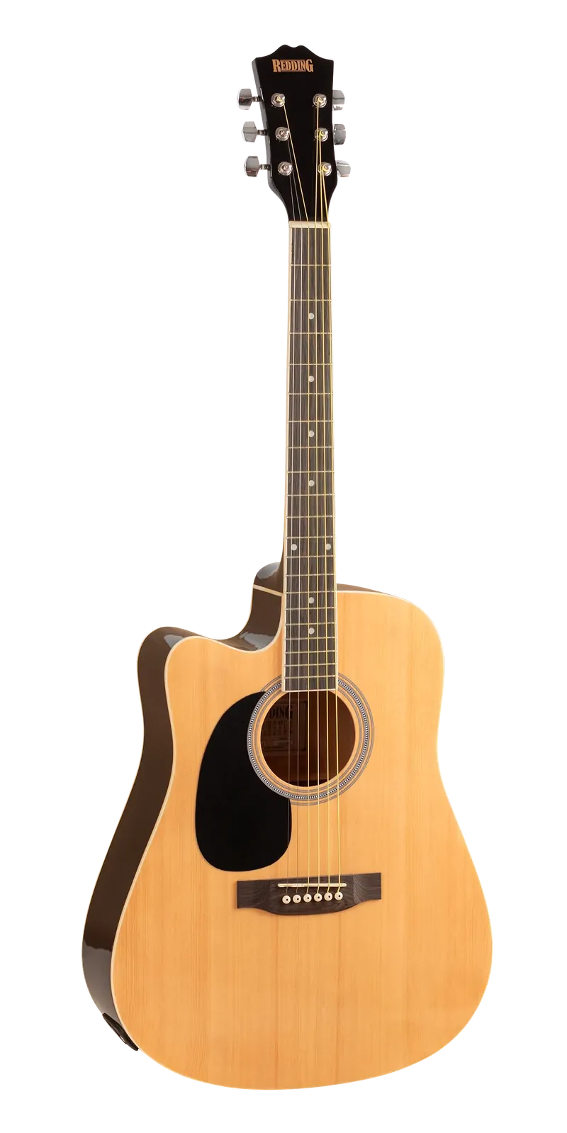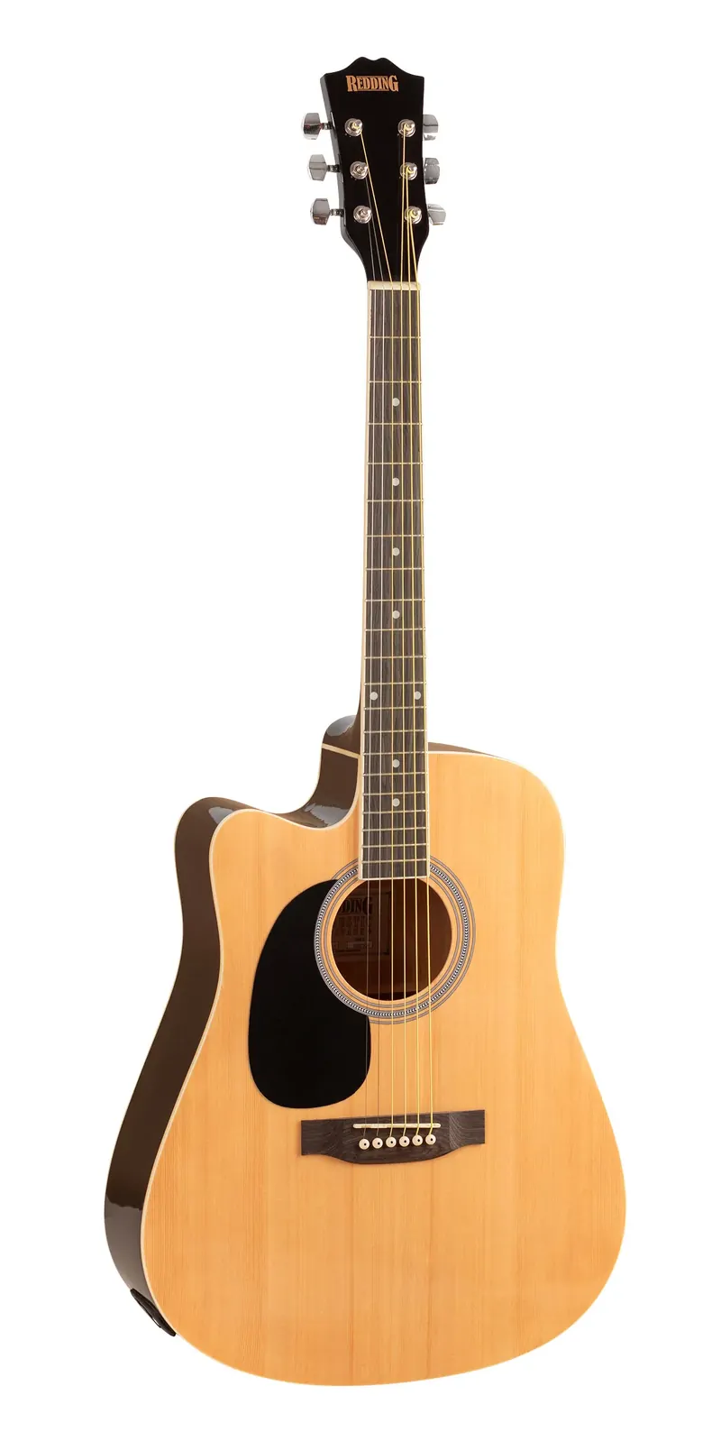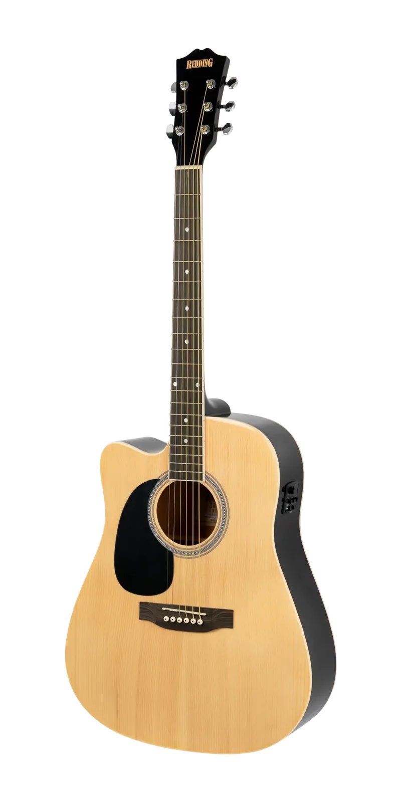 The Redding RED50CELH Left-Handed Acoustic Electric Guitar is expertly crafted for left-handed players, making it an ideal choice for both beginners and experienced musicians. This guitar combines comfort and playability, tailored specifically for your dominant hand. Featuring a solid spruce top and basswood back and sides, the RED50CELH delivers a rich and balanced sound. The cream bound catalpa neck is complemented by a rosewood fingerboard adorned with pearl dot inlays, providing both aesthetic appeal and smooth playability. Key features include: - Dreadnought body shape for enhanced projection - Cream bound body with a triple ring herringbone rosette - Black teardrop scratchplate for added protection - Rosewood bridge with a compensated saddle for optimal intonation - Chrome diecast machine heads for precise tuning stability Additionally, this guitar comes with a UPlay Guitar Guide and access to free online lessons, ensuring you have the resources needed for proper maintenance and skill development. The Redding RED50CELH is not just a well-crafted instrument; it's a reliable partner for your musical journey, designed to keep you playing comfortably and confidently.