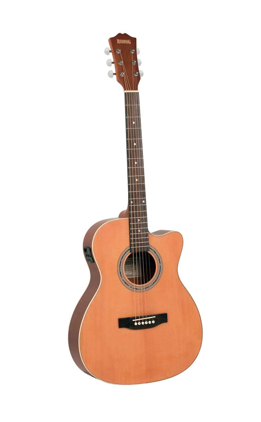 The Redding RTO72CENS Acoustic/Electric Guitar in Natural Satin is a beautifully crafted instrument designed for musicians who value both aesthetics and sound quality. This guitar features a sleek natural satin finish that enhances its classic design, making it an appealing choice for players of all styles. Key features of the RTO72CENS include: - Cedar top for a warm, rich tone - Mahogany back and sides for durability and resonance - Maple 4-ply black/white top binding and 2-ply black side and back binding for added elegance - Black bound nato neck with a Rockwood fingerboard and pearl dot inlays for a refined touch - Triple ring pearloid rosette that adds to its visual appeal - Rockwood bridge with a compensated saddle for improved intonation - Grover style chrome diecast machine heads for precise tuning stability - Equipped with D'Addario USA strings for quality performance - Redding 3-band EQ preamp with an LCD chromatic tuner for versatile sound control - Rotary volume, low, middle, and high controls, along with phase shift and tuner switches for enhanced playability - Low battery LED indicator to keep you informed - Powered by a 9-volt battery and features a piezo under-saddle pickup for excellent amplification The Redding RTO72CENS is perfect for players who appreciate a refined aesthetic combined with reliable acoustic tones, making it an excellent choice for various playing styles and settings.