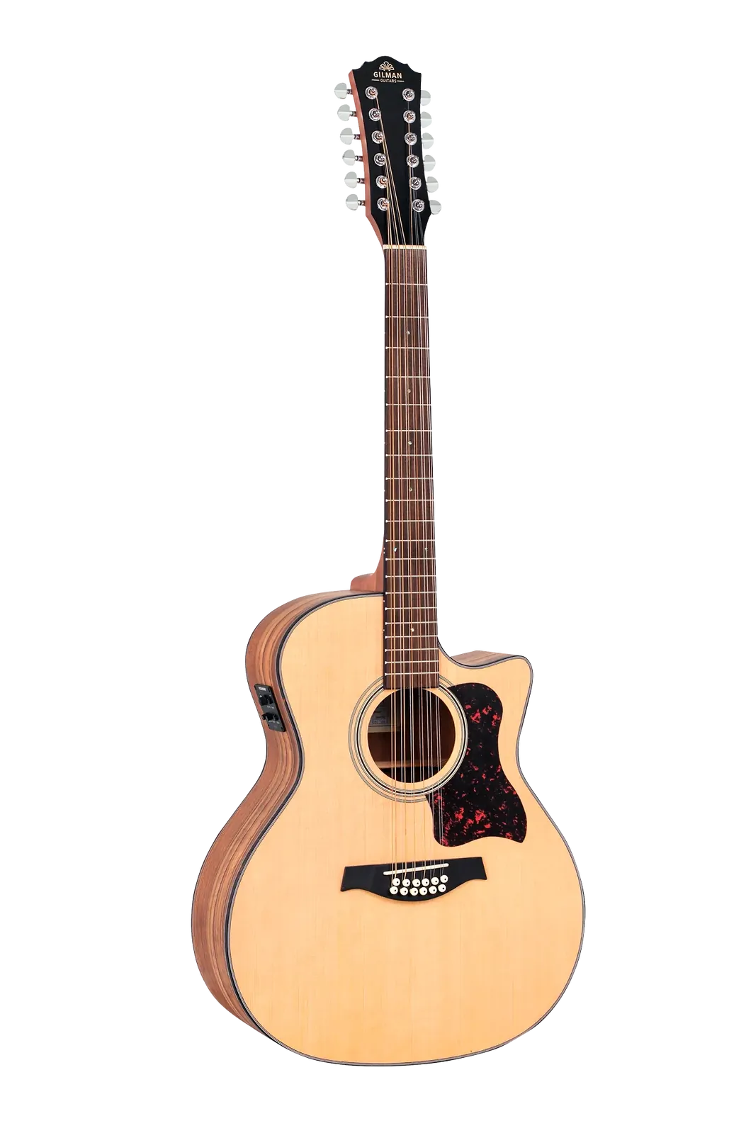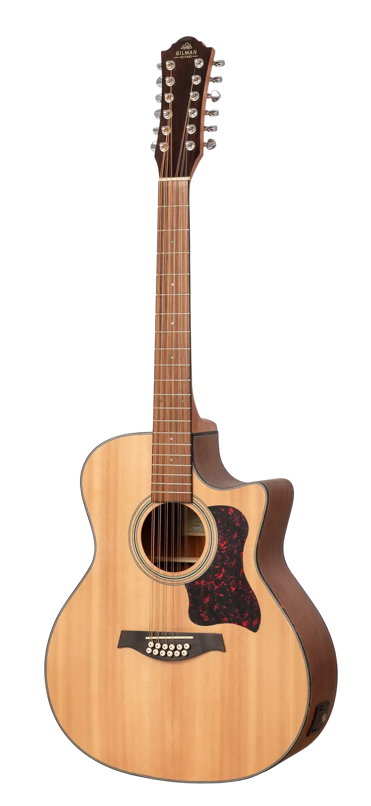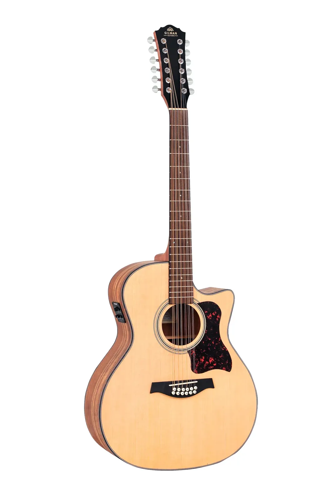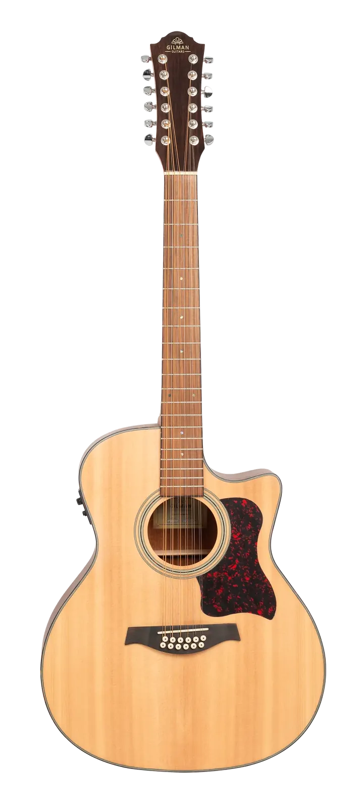 The Gilman 12-String Grand Auditorium Acoustic-Electric Guitar GA112CE is designed to deliver a perfect blend of rich acoustic tone and versatile electric capabilities. This guitar features a Grand Auditorium body shape with a Venetian cutaway, allowing for easy access to higher frets, making it ideal for both beginners and experienced players. Crafted with premium tonewoods, the GA112CE boasts a spruce top complemented by walnut back and sides, providing a warm and resonant sound. The elegant design includes tortoiseshell 4-ply ivory/black top binding and 3-ply side and back binding, enhancing its aesthetic appeal. Key features of the Gilman GA112CE include: - Tortoiseshell bound nato neck with a black walnut fingerboard - 4mm pearl dot inlays for a classic look - Dovetail neck joint for improved stability - Double ring rosette and center back strip for added detail - Black walnut bridge for optimal tonal transfer - Graph Tech Canada NuBone XB nut and compensated saddle for enhanced playability - Grover style chrome diecast machine heads for precise tuning - D'Addario USA strings for reliable performance - Fishman pickup system with Presys II 2-band EQ preamp, featuring an inbuilt LCD tuner, tuner and phase switches - Rotary volume, bass, and treble controls for sound customization - Battery LED indicator for easy monitoring The guitar is finished in a natural satin, providing a sleek and professional appearance. It comes packaged in a black printed display box and includes the UPlay Guitar Guide along with free online lessons, making it an excellent choice for players seeking a versatile 12-string guitar suitable for both acoustic performances and amplified settings.