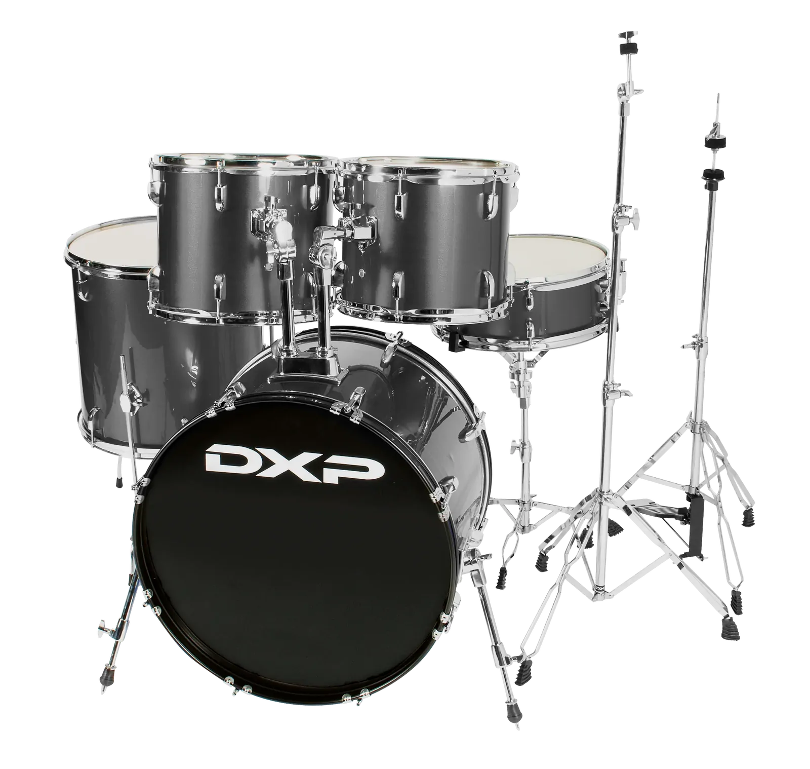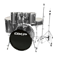 The DXP Pioneer Series 5 Piece Drum Kit in Gun Metal Grey is designed for drummers who value both performance and aesthetics. This complete drum set features a sleek gun metal grey finish that adds a contemporary touch to your setup. The kit comprises: - 22"x16" bass drum with 16 lugs - 16"x16" floor tom with 12 lugs - 13"x11" and 12"x10" power toms, each with 12 lugs - 14"x5" wood shell snare drum with 12 lugs Constructed with 6-ply, 7.5mm shells, this drum kit ensures robust sound quality and durability. The medium weight double-braced hardware includes essential components such as snare, hi-hat, and cymbal stands, as well as a bass drum pedal and heavy-duty retractable bass drum spurs. The kit also comes with heavy-duty tom holders and mounts, complete with memory locks for added stability. Ideal for both beginners and seasoned drummers, the DXP Pioneer Series Drum Kit combines reliable performance with a stylish appearance, making it a perfect addition to any drummer's collection.