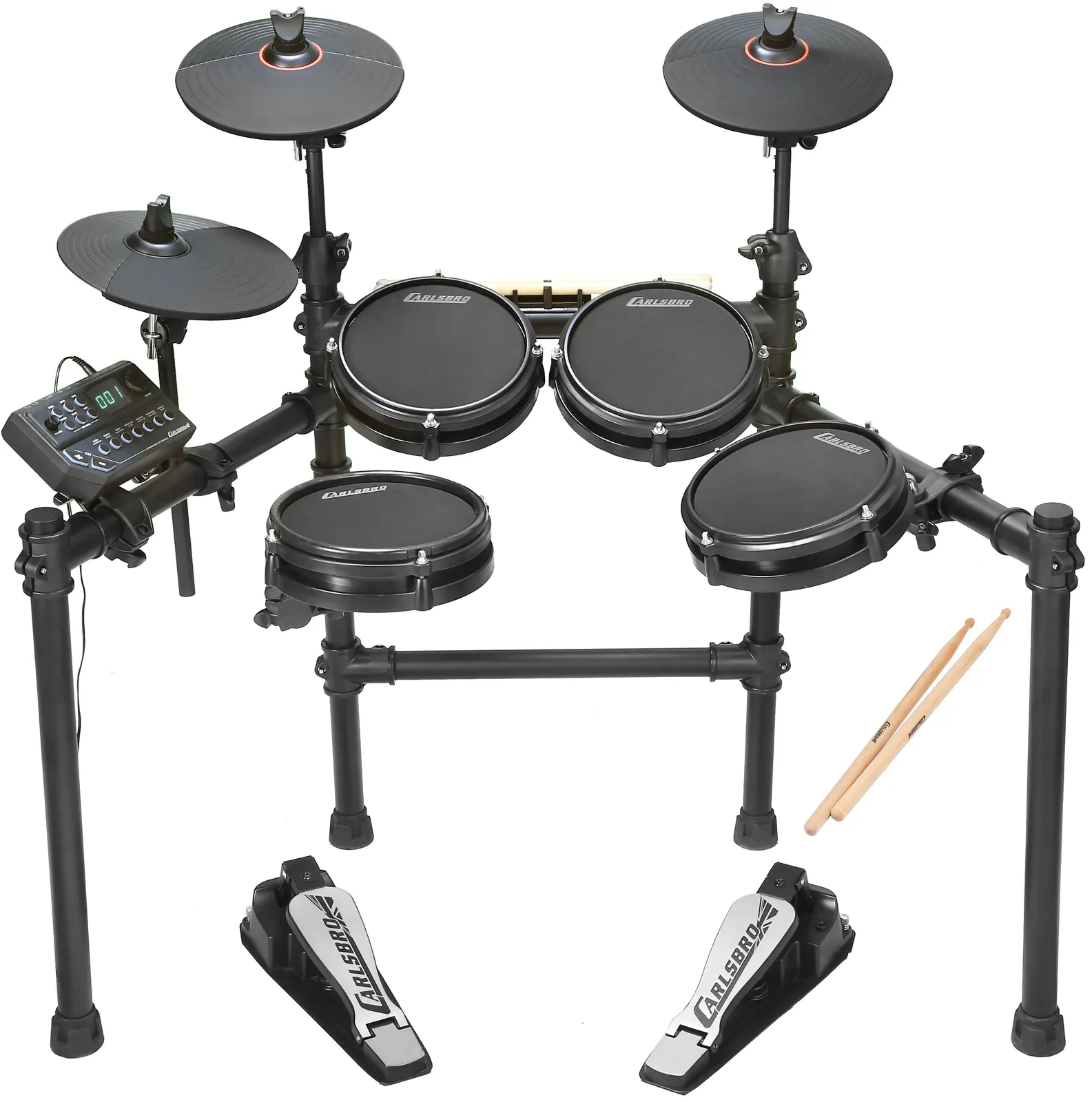 The Carlsbro CSD125M E-KIT Electronic Drum Kit is a versatile and feature-rich electronic drum set designed for drummers of all levels. This 7-piece kit includes 4x 8” mesh drum pads that provide a realistic playing experience with low-profile drum rims, enhancing accuracy and minimizing unwanted rim shots. The mesh heads are designed to reduce noise, making this kit ideal for home practice. Key features of the CSD125M include: - Tri-zone snare drum pad that captures rimshots, center hits, and edge strikes separately for expressive playing - 250 built-in voices offering a wide range of drum sounds - 20 preset drum kits along with 10 user-customizable kits for personalized setups - 3x 10” cymbals equipped with a choke feature for crash and ride sounds - Dual headphone sockets, perfect for teaching and practicing without disturbing others - USB audio recording capabilities for high-quality sound direct to your DAW - User-defined drum kit builder for creating unique drum sounds - Fully adjustable frame to accommodate drummers of all ages and sizes, easily convertible for left-handed players - Preassembled frame for quick and easy setup, with hand fastening wing nuts and a drum key included The CSD125M is powered by the Commander 25 sound module, which utilizes advanced sensor technology to alleviate dead spots and improve playability. This kit is perfect for both quiet practice and performance, allowing you to adapt to any playing situation. Unlock your drumming potential with the Carlsbro CSD125M E-KIT, a perfect blend of technology and user-friendly design for an engaging drumming experience.