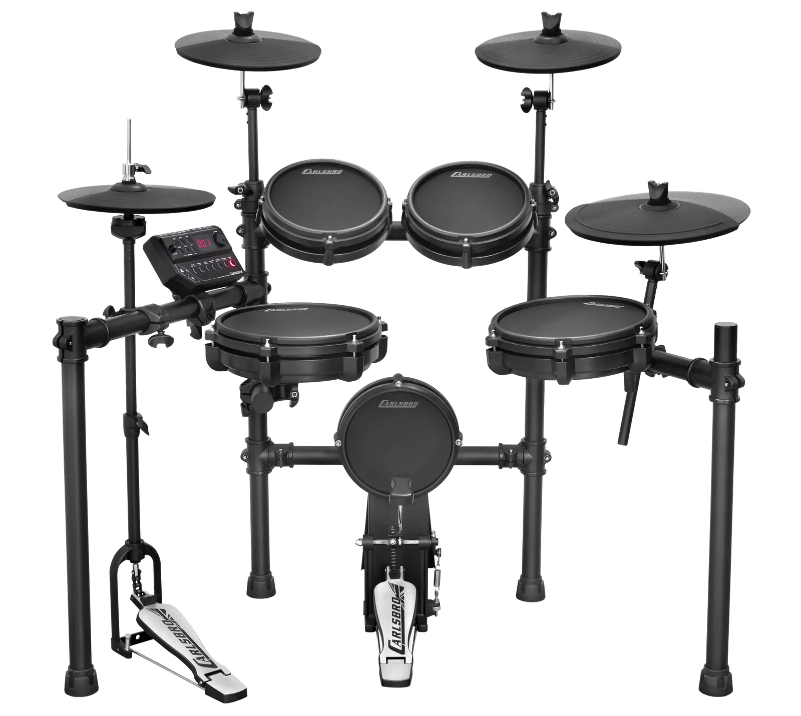 The Carlsbro CSD45M 45mm Mesh Electronic Drum Kit is designed to deliver an immersive and realistic drumming experience, perfect for both practice and performance. This electronic kit features high-quality mesh drum pads that provide a natural feel and dynamic control, catering to drummers of all skill levels. Key features of the CSD45M include: - 9-piece configuration with 2 x 10" and 2 x 8" dual zone mesh drum pads - 3 x 10" cymbals and 1 x 12" cymbal, all equipped with a choke function - Innovative legless open/close hi-hat stand that mimics the playability of an acoustic kit - Fully adjustable frame for customizable positioning and setup - USB audio and MIDI interface for seamless connectivity to your DAW and MIDI devices - Dual headphone outputs for quiet practice and teaching situations - User-defined drum kit builder for personalized sound settings The CSD45M's dual zone triggering technology enhances playability by providing defined regions for different sounds, while its low-profile mesh pad rims reduce noise from unwanted rim shots. The included Command 25 sound module is equipped with advanced features, making it an excellent choice for drum schools and home practice. With its compact design and easy setup process, the Carlsbro CSD45M is an ideal solution for drummers looking for a high-quality electronic drum kit that doesn't compromise on performance or versatility. Enjoy the benefits of a professional drumming experience in the comfort of your own space.