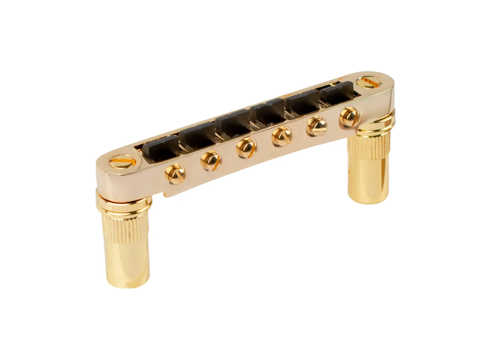 The Graph Tech ResoMax NV2 Tune-O-Matic Bridge with 6mm Gold Posts is an exceptional upgrade for guitarists seeking enhanced performance and aesthetics. This bridge is crafted from a lightweight, high-strength alloy that significantly increases harmonic content and tonal clarity, making your guitar resonate with rich, vibrant tones. Key features include: - 6mm diameter posts for secure and stable mounting - Striking gold finish that combines style and durability - Tune-O-Matic design for precise intonation and improved sustain - Preloaded with String Saver saddles to reduce string breakage and enhance tuning stability - Exclusive AutoLock feature that secures the bridge to your guitar without the need for tools - Triple plated for added durability and long-lasting good looks This bridge is compatible with various guitar brands, including Epiphone, ESP, LTD, BC Rich, Carvin, and Schecter, making it a versatile choice for upgrading or replacing your existing bridge. With the ResoMax NV2, you can achieve superior sound quality while enhancing the visual appeal of your instrument. Upgrade your guitar today and experience the difference in tone and performance.