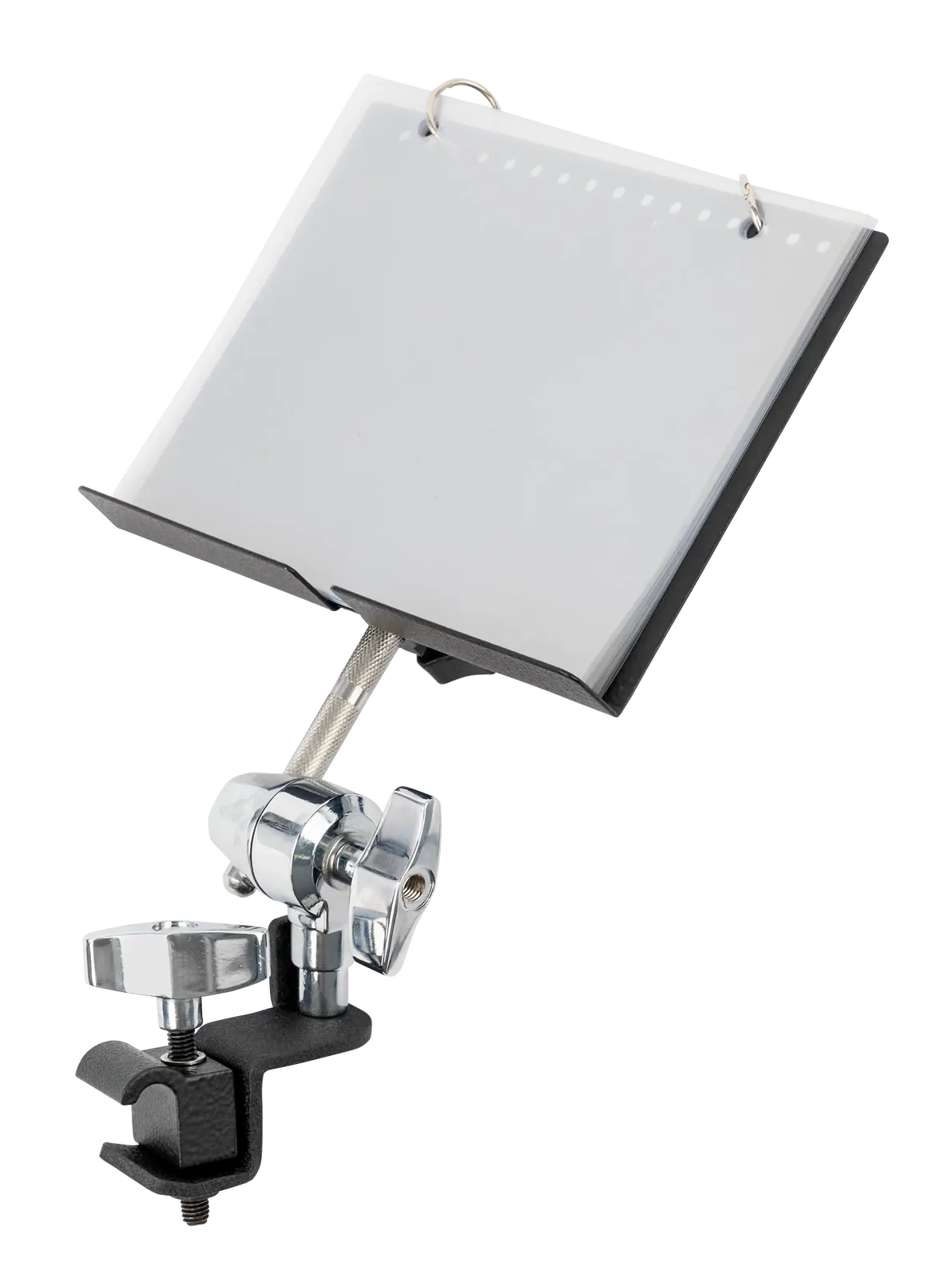 The AMS MUSIC HOLDER - HOOP MOUNTABLE is an essential accessory for musicians looking to enhance their performance experience. This versatile lyre is designed to securely mount on snare, tom, and floor tom hoops, providing easy access to your music while on the move. Key features include: - Metal music desk with a sleek black finish - Equipped with 5 clear plastic music folders that can be flipped for quick page turns - 360-degree adjustability for optimal viewing angles - Compatible with traditional sheet music, tablets, and smartphones - Music desk dimensions: 185mm (W) x 150mm (H) This music holder is perfect for percussionists who need a reliable and flexible solution to keep their music accessible during performances and rehearsals. With its adjustable positioning and durable construction, the AMS MUSIC HOLDER is a must-have for any marching band or drumline.