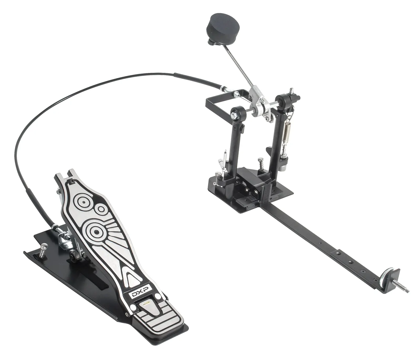 The DXP Cajon Pedal Heavy Duty Cable Driven with Adjustable Spring Tension is designed to enhance your cajon playing experience with smooth, reliable action and customizable settings. Its robust construction and adjustable features make it ideal for players seeking precision and comfort during performances. - Heavy duty black cast primary pedal for durability - Cable-driven slave mechanism for responsive play - Self-leveling foam beater for consistent sound - Adjustable spring tension to customize pedal feel - Multi-position clamp mount with tightening screw to secure cajon - Large metal base plate with stabilizing screws for added stability - Velcro underneath base plate to prevent movement This pedal offers excellent durability and adaptability, making it a valuable addition for any cajon player looking to improve their rhythm and control.