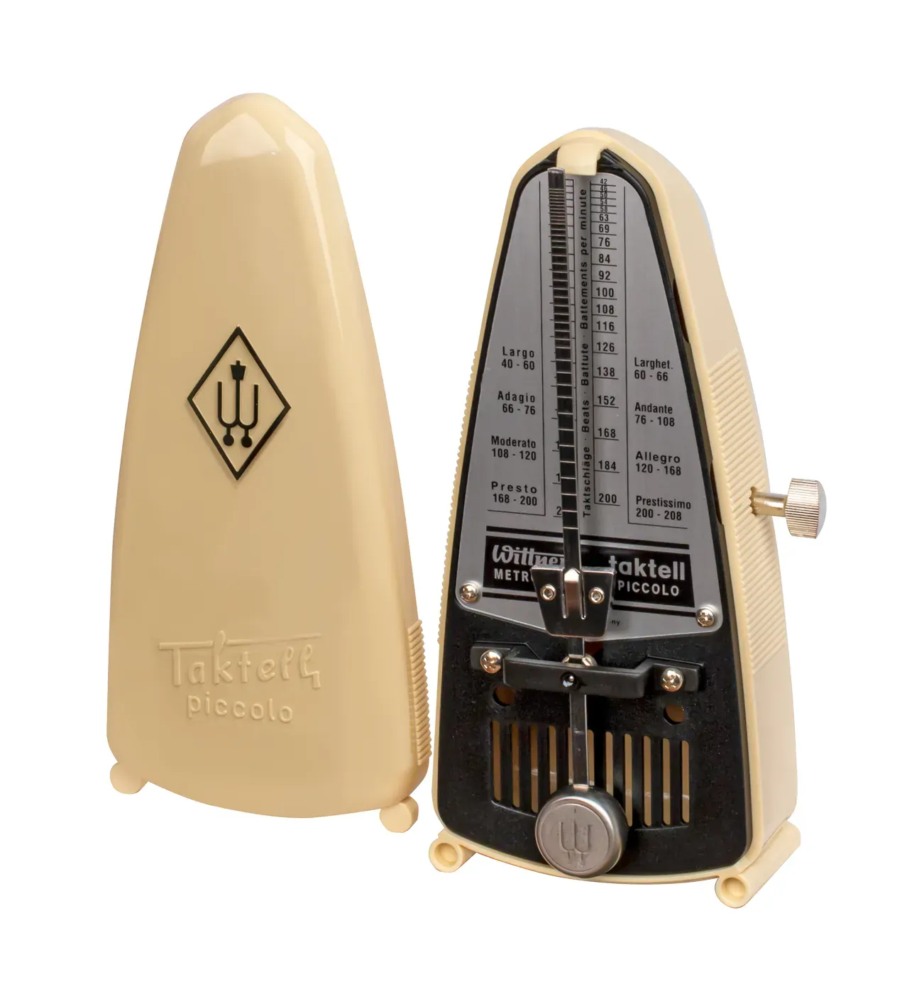 The Wittner Taktell Piccolo Metronome No Bell in Ivory is a classic and reliable tool for musicians seeking precise tempo control. This mechanical metronome features a durable ivory plastic casing, ensuring both style and longevity. Key features of the Wittner Taktell Piccolo Metronome include: - Key wound mechanism for consistent tempo regulation - Tempo range from 40 to 208 beats per minute - Compact piccolo size without a bell, making it easy to transport - Sleek ivory-colored plastic casing for an elegant appearance Ideal for musicians of all levels, this metronome supports focused practice and timing improvement, making it a perfect addition to any practice session. Made in Germany, the Wittner Taktell Piccolo Metronome combines quality craftsmanship with functionality.
