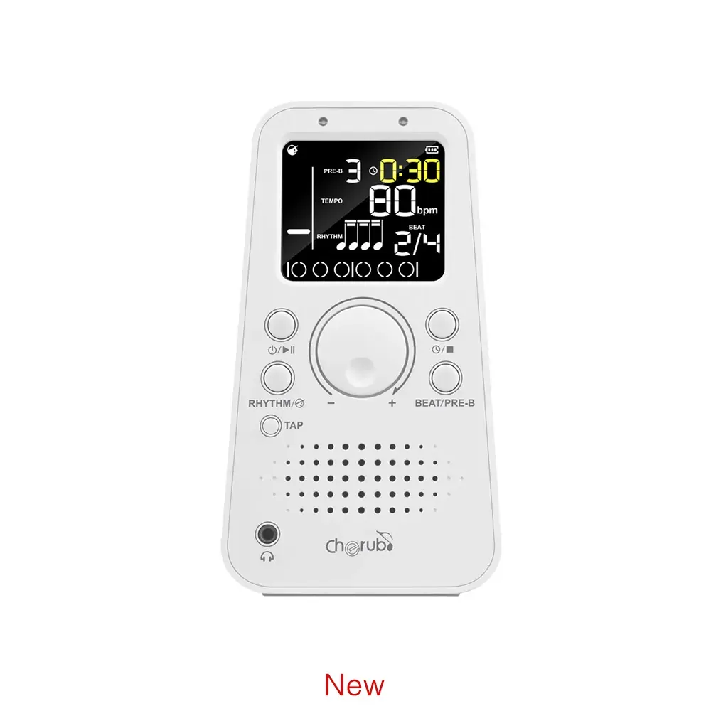 The Cherub Rechargeable Pyramid Electronic Metronome with LCD Display is a sleek and versatile tool designed to help musicians maintain perfect timing. Featuring a durable plastic casing and a stylish white finish, this metronome combines functionality with modern aesthetics. The large, colorful LCD screen ensures clear visibility, making it easy to read even from a distance. With multiple sound options to choose from, practicing becomes more enjoyable and efficient. Key features include: - Four metronome sounds: mechanical, cowbell, electronic, and vocal count - Tempo range from 40 to 208 beats per minute - Tap tempo function for quick tempo setting - Countdown timer to manage practice sessions - Headphone output jack (3.5mm stereo mini jack) for private use - USB-C charging port with included cable for easy recharging - Up to 8 hours of battery life on a single charge This rechargeable electronic metronome is an excellent companion for both practice sessions and performances, providing reliability and portability for musicians of all levels.
