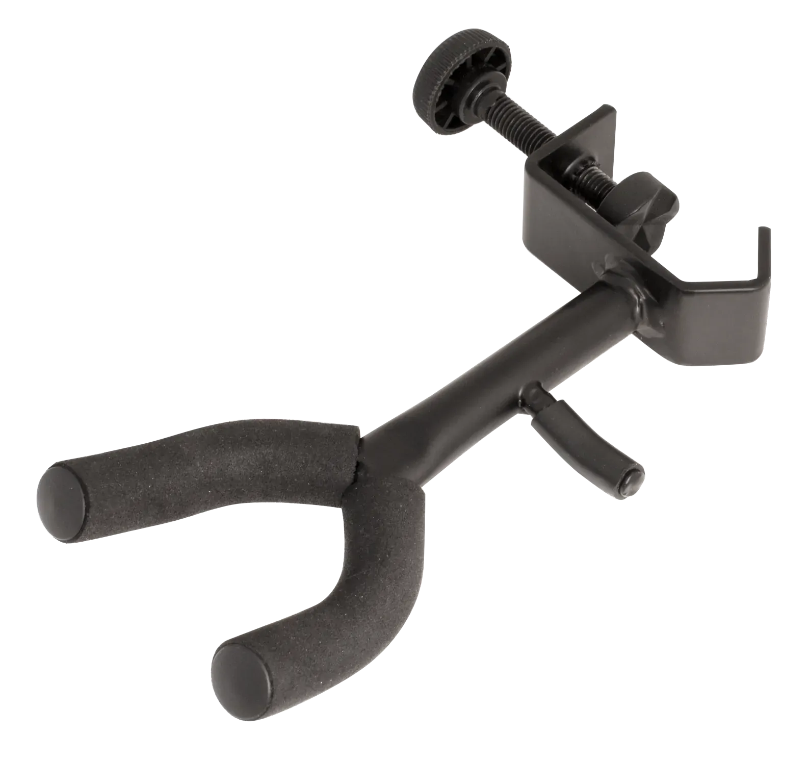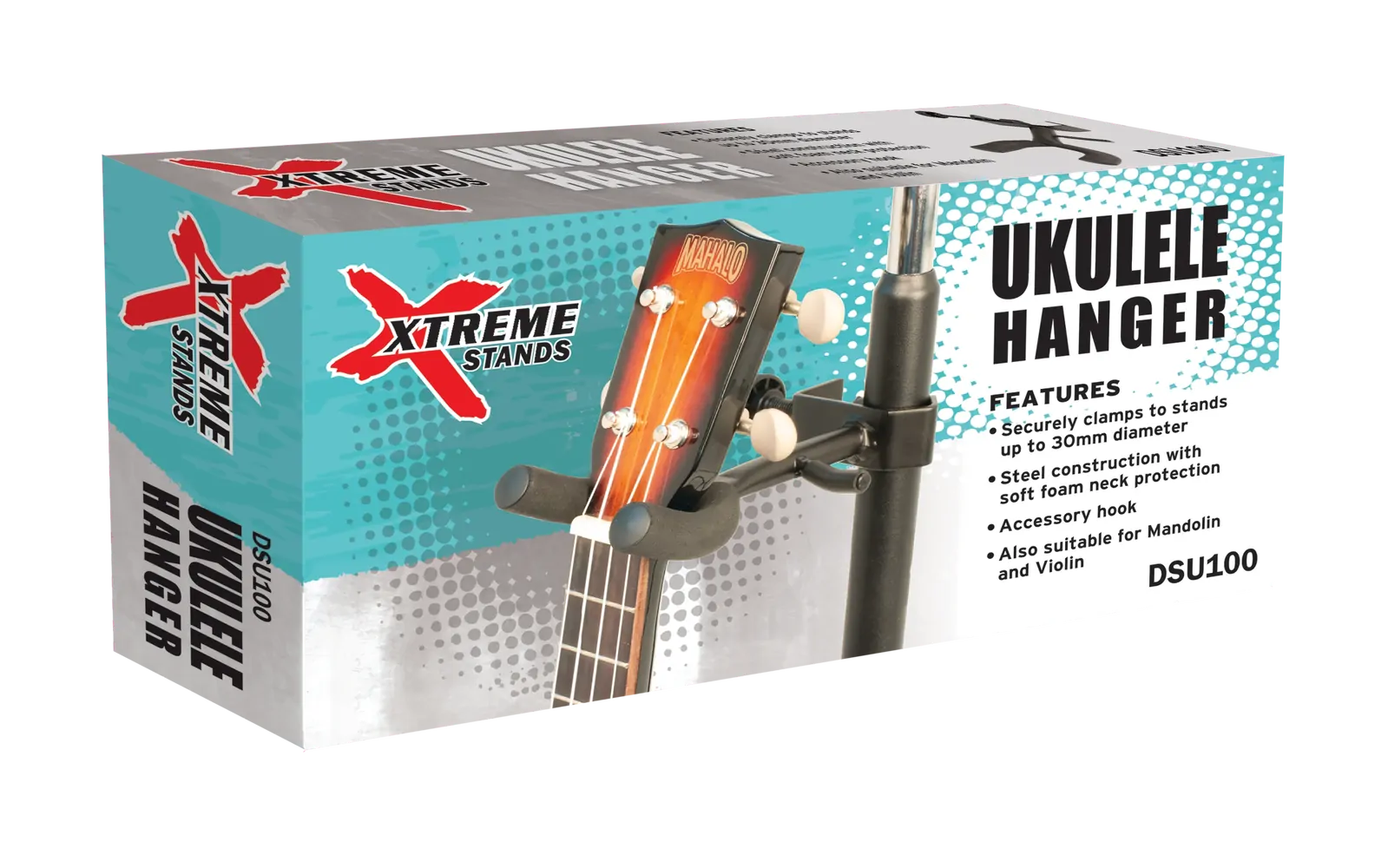 The Xtreme Ukulele Hanger Clamp-On Model DSU100 is an essential accessory for any ukulele player looking to keep their instrument safe and accessible. Designed to securely clamp onto most stands with a diameter of up to 30mm, this hanger ensures your ukulele remains within reach during practice or performance. Key features of the Xtreme DSU100 include: - Secure clamping mechanism compatible with stands up to 30mm in diameter - EVA foam padded arms, 41mm wide, providing gentle support for your instrument - Versatile design suitable for ukuleles, mandolins, and violins - Accessory hook for holding straps, capos, bows, and other small items - Durable solid steel construction for long-lasting stability - Sleek black finish, making it a stylish addition to any setup Whether you're in the studio, on stage, or at home, the Xtreme Ukulele Hanger is the perfect solution for keeping your ukulele safe and easily accessible.