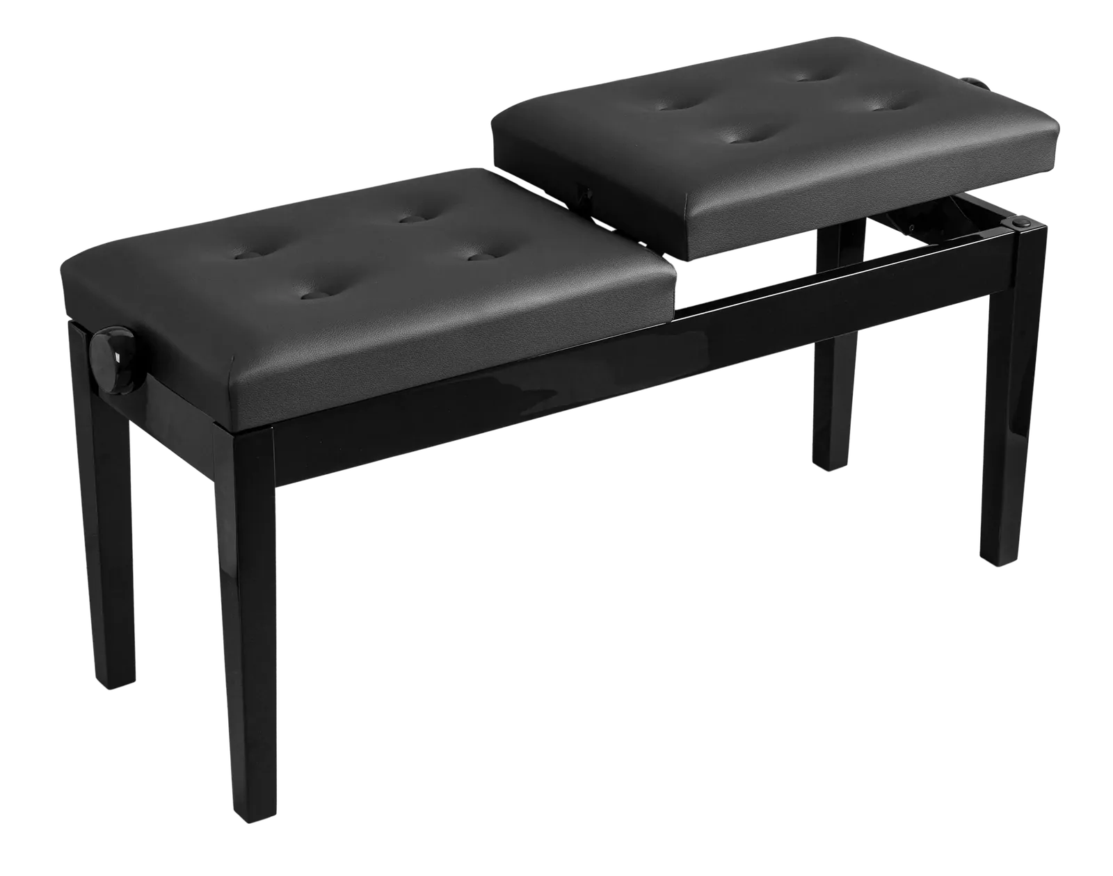 The Hemingway Duet Piano Bench HPB44B is an ideal choice for pianists seeking comfort and style during duet performances. This bench features two individually height-adjustable seats, allowing you to customize your seating for optimal comfort. Constructed from strong wood, the bench is both durable and elegant, with button tufted black vinyl upholstery that adds a touch of sophistication. The independent worm drive height adjustment is easily operated with wooden knobs, ensuring that each player can find their perfect height. Key features include: - Two individually height-adjustable seats for personalized comfort - Button tufted black vinyl upholstery for a stylish finish - Each seat measures 49cm wide by 49cm deep - Independent worm drive height adjustment with wooden knobs - Straight, polished ebony legs for stability and aesthetic appeal - Overall dimensions: 98cm wide x 34cm deep x 47.5-57.5cm adjustable height This bench is perfect for duet pianists, as well as teachers and students sharing a bench, combining practical features with a classic design to enhance your playing experience.
