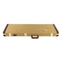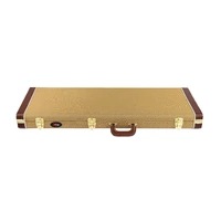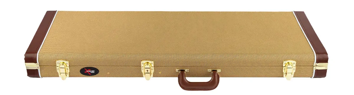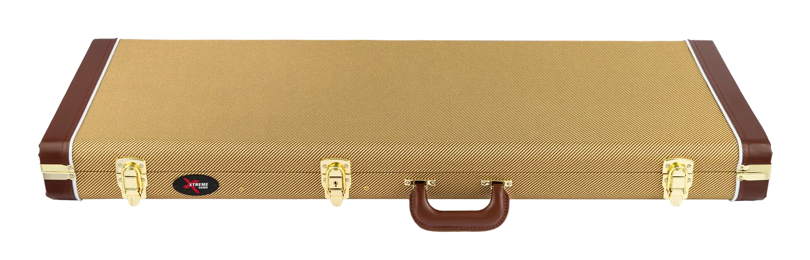 The Xtreme Electric Case in Vintage Yellow Tweed is designed to provide stylish and reliable protection for your Stratocaster or Telecaster guitar. This hardcase features a vintage rectangular shape that blends classic aesthetics with durable construction, ensuring your instrument remains safe during transport or storage. - Plywood construction covered in vintage yellow tweed for durability and style - Stitched brown end caps with white piping enhance the classic look - Soft red plush lined padded interior protects your guitar's finish - Large accessory storage compartment with lid for cables, picks, and more - Dual neck supports secure the guitar firmly in place - Classic stitched brown leatherette handle for comfortable carrying - Three deluxe gold drawbolt latches with lock for secure closure - Xtreme logo plate adds an authentic vintage touch This vintage-style guitar case is an excellent choice for musicians seeking dependable protection wrapped in a timeless design, making it perfect for both gigging and storage. Suitable for most standard Strat, Tele, and RG style right or left-handed electric guitars, the Xtreme Electric Case ensures your prized possession is kept safe and sound.
