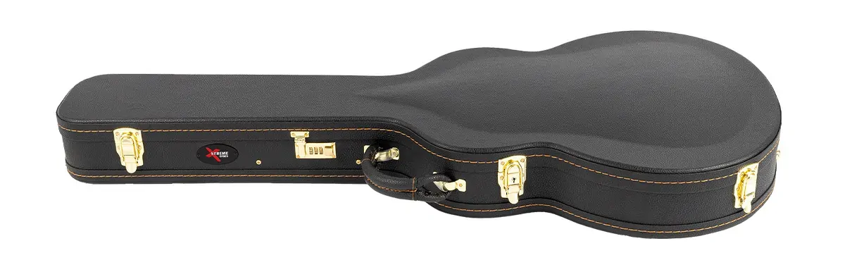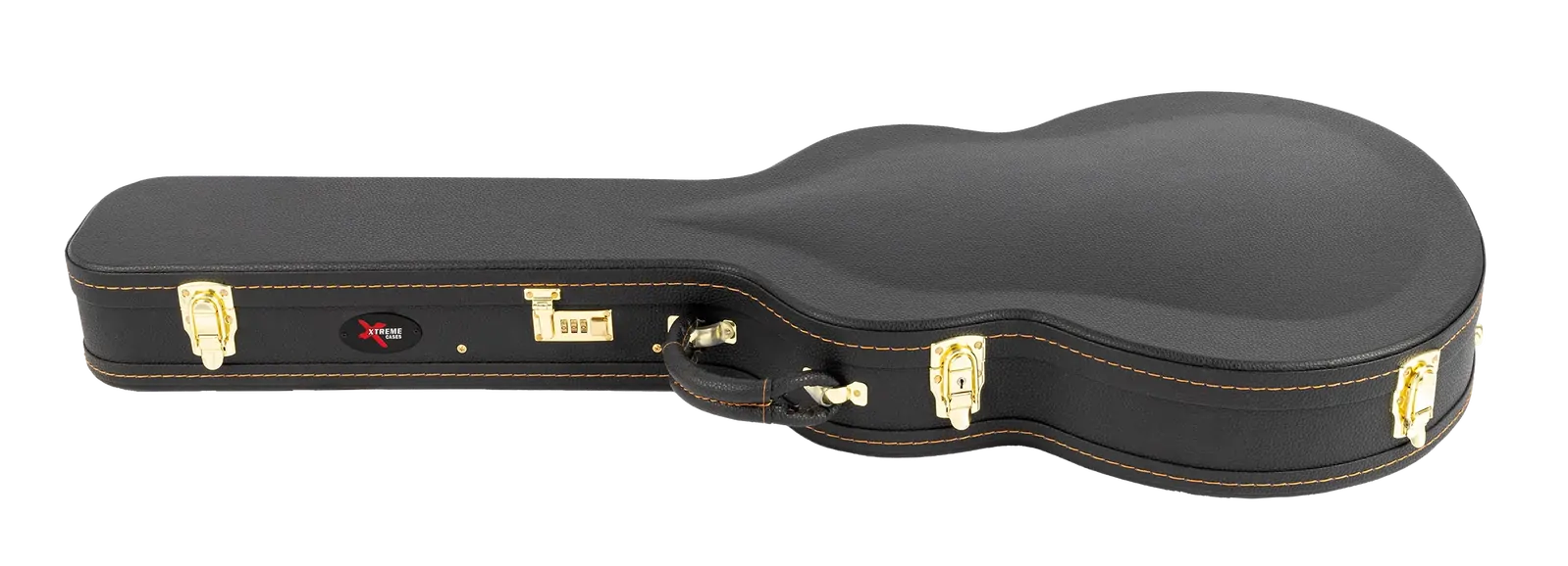The Xtreme DLX 335 Semi-Acoustic Guitar Case in Black Vinyl with Lock is designed to provide robust protection and a stylish appearance for your semi-acoustic guitar. This case is crafted with heavy-duty plywood and features a striking black vinyl exterior accented with orange stitching, ensuring your instrument is both safe and visually appealing. Key features include: - Heavy-duty plywood construction covered in black vinyl with orange stitching - Arched top design to fit 335 shape guitars - Thick foam interior padding for superior protection - Black plush lining with a fitted black protective internal blanket - Covered accessory compartment for convenient storage - Ergonomic imitation leather handle for comfortable carrying - Five deluxe gold drawbolt latches for secure closure - Combination lock with customizable 3-digit code for added security - Xtreme logo plate for a distinctive look This case is ideal for musicians seeking reliable protection and a sleek appearance for their semi-acoustic guitar, whether for gigging, storage, or travel.