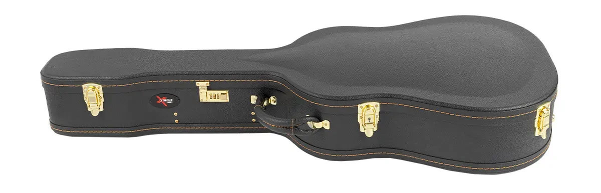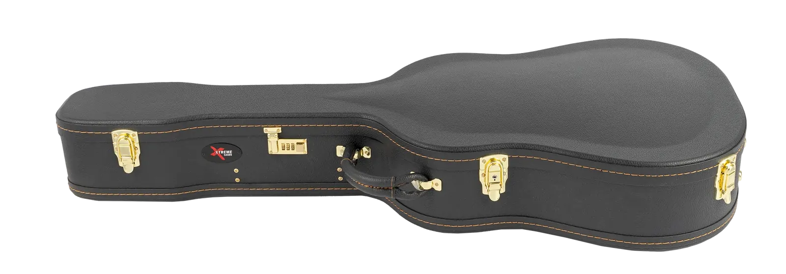 The Xtreme DLX Dreadnought/12-String Acoustic Guitar Case is designed to provide robust protection and secure storage for your dreadnought and 12-string guitars. Crafted from heavy-duty plywood and covered in stylish black vinyl with orange stitching, this case combines durability with a sleek appearance. Key features include: - Arched top design for added strength and aesthetic appeal - Thick foam interior padding that ensures superior protection for your instrument - Luxurious black plush lining accompanied by a fitted black protective internal blanket - Covered accessory compartment for storing essential items - Ergonomic imitation leather handle for comfortable carrying - Four deluxe gold drawbolt latches for secure closure - Combination lock with a customizable 3-digit code for enhanced security - Distinctive Xtreme logo plate for a touch of style This guitar case is ideal for musicians seeking a reliable and secure solution to protect their instruments during transport and storage, whether on the road or at home.
