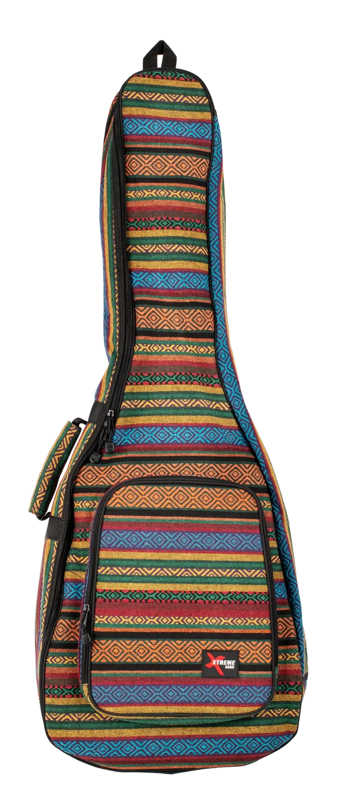The Xtreme TB705W Bohemian Western Gig Bag for Acoustic Guitar combines vibrant style with durable protection, making it an excellent choice for musicians on the go. Featuring a striking multi-colored weave pattern fabric, this gig bag stands out while ensuring your instrument remains safe during transport. Key features include: - 5mm sponge padded and lined interior for enhanced protection - Reinforced areas at the headstock and bridge for added durability - Full-length zipper for easy access to your guitar - One accessory/music pocket for convenient storage - Cross-stitched cushioned carry handle for comfortable transport - Two adjustable shoulder straps with comfort pads for personalized fit - Moisture-resistant bottom with rubber tread for stability - Toggles on all zippers for secure closure - Embroidered Xtreme logo for brand recognition This gig bag is perfect for musicians seeking both eye-catching design and reliable protection for their instrument, making it a great choice for daily use and travel.