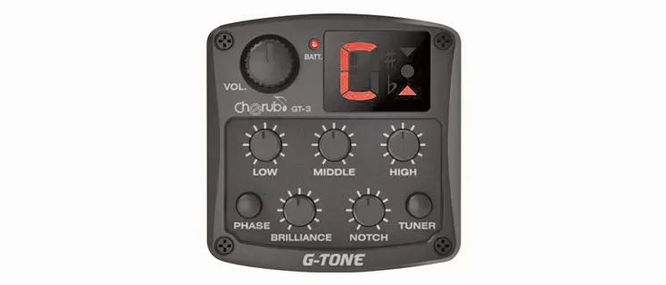 The Cherub G-TONE 4 Band EQ Preamp with Pickup is an essential tool for acoustic guitar players looking to enhance their instrument's natural sound. This preamp features a versatile 4-band EQ, allowing musicians precise control over their tone with rotary controls for volume, low, middle, high, brilliance, and notch frequencies. Designed for both practice and live performance, the G-TONE preamp includes a clear backlit LCD display for easy viewing, even in low-light conditions. The built-in chromatic tuner ensures you can keep your guitar perfectly in tune, with a dedicated tuner display for convenience. Additional features include phase and tuner switches for enhanced sound control, a low battery LED indicator, and a separate battery compartment for easy access. The under-saddle piezo pickup captures your acoustic sound accurately, making this preamp ideal for any performance setting. It comes complete with a 9-volt alkaline battery, providing up to 100 hours of battery life, ensuring you’re always ready to play. Whether you're on stage or in the studio, the Cherub G-TONE 4 Band EQ Preamp is designed to help you achieve reliable tone shaping and tuning capabilities in a compact and user-friendly package.