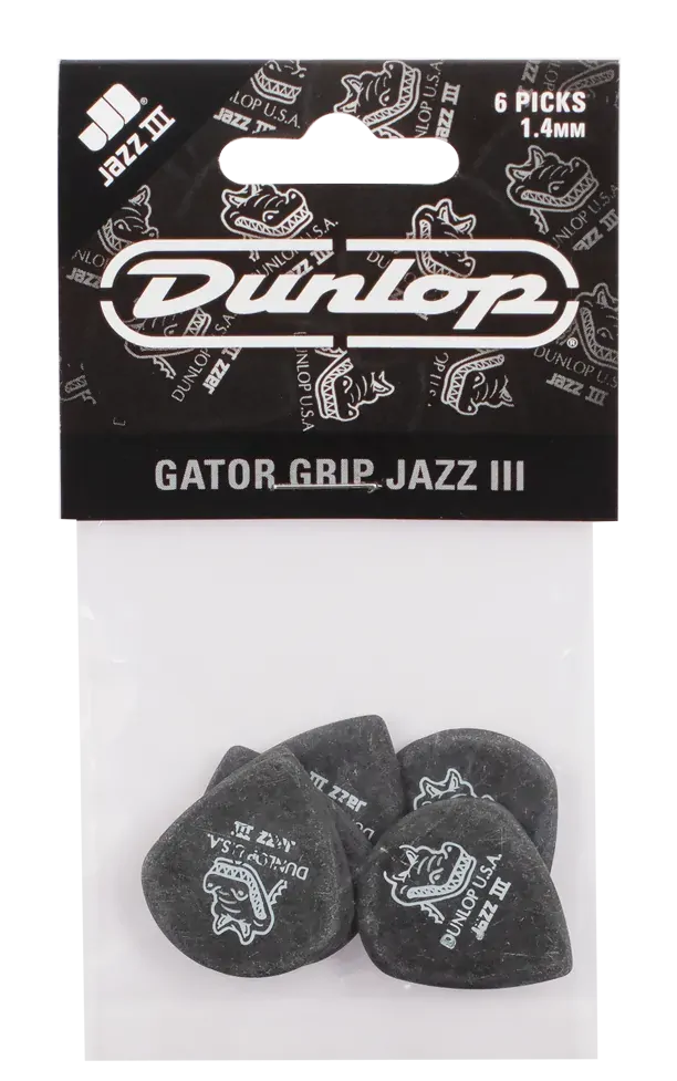 The Jim Dunlop Gator Grip Jazz III Guitar Picks are designed for guitarists who seek precision and enhanced playability. With a thickness of 1.4mm, these picks provide a sturdy feel that is perfect for fast picking and intricate playing styles. - 1.4mm thickness for a firm and precise playing experience - Gator Grip texture for improved hold and control - Custom header card display bag containing 6 picks - Moulded bevelled edge for smoother playing and more articulate tone These picks are an excellent choice for both practice and performance, offering the accuracy and durability that discerning guitarists demand.