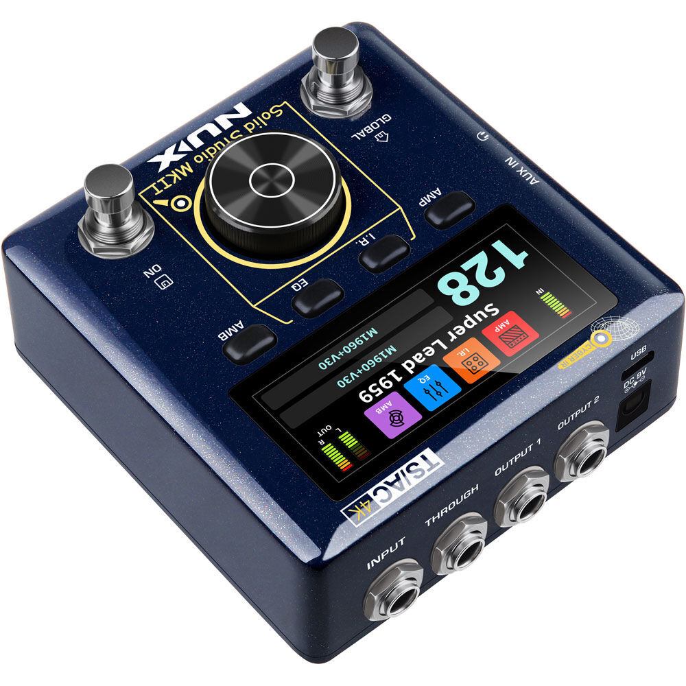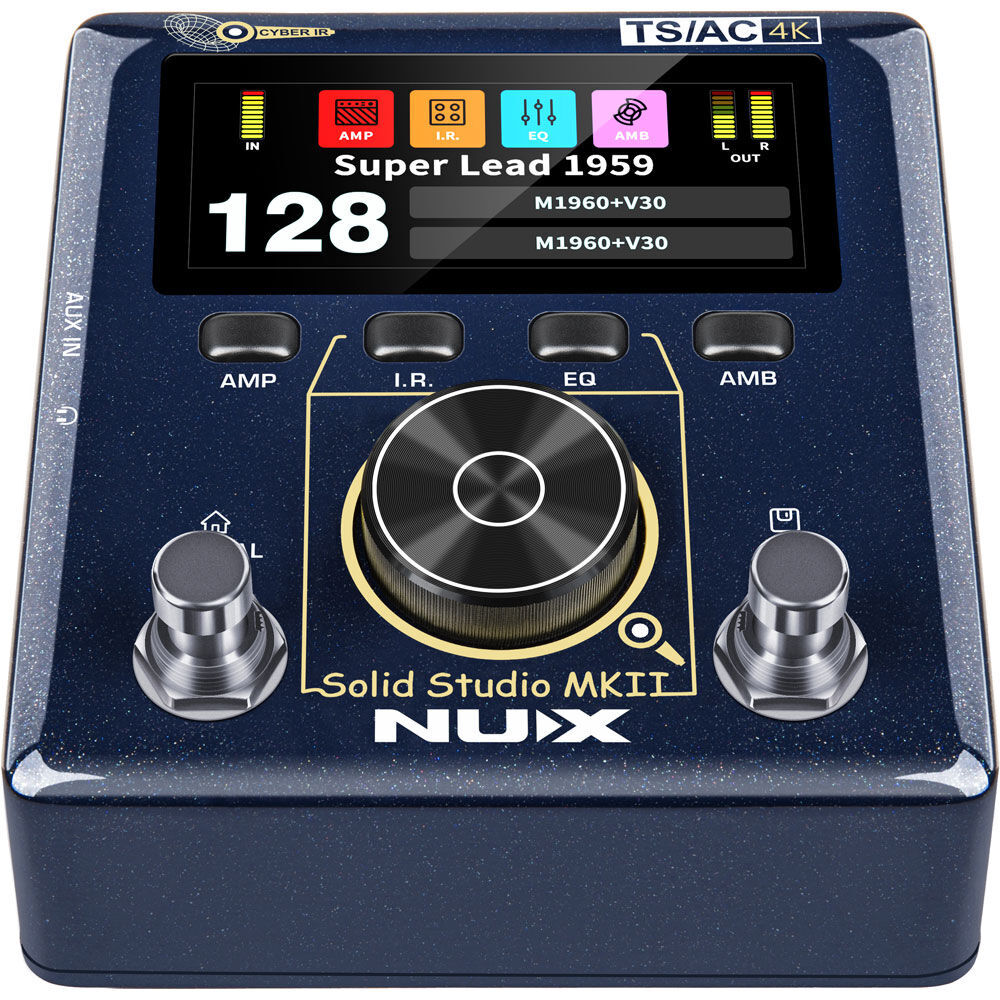 The Solid Studio MKII (NSS-6) has the most iconic Physical Amp Modeling algorithm: TSAC-4K with an independent Preamp and Power Amp combination. TSAC-4K (White-box) algorithm brings realistic playability and the tube amp’s negative feedback response. This groundbreaking technology will offer you the best performance, and you can experience that ANALOG FEELING. FEATURES: Stereo CYBER IR™ Engine with dual 1024 samples resolution. Independent Pre & Power amp simulation with TSAC-4K white-box amp modeling algorithm. World-class amp modeling algorithm with full functions. (Like 4 inputs for patch cable jumping). *Currently 8 classic AMP models. One-piece die-cast aluminum chassis. AMP, 1.R., EQ, AMB effect blocks with free routing order. 2.86" colour LCD display (960*376) with intuitive operations. 128 preset slots, independent L/R 60 IR slots. Built-in NOISE GATE, EQ, PHONES LEVEL, AUX IN LEVEL, OUT LEVEL in global setting. NORMAL, INJECT input modes. (INJECT to parallel the power amp signal.) USB audio interface, firmware update, SOLID STUDIO editor™ edit software. USB-C MIDI, THROUGH jack (parallel the Power Amp signal), stereo balanced 1/4" outs with GND lift, Phones Out for silent practice. Great Dynamic Range: 110dB. Ultra-low latency: 0.85ms (bypass), 1.9ms (efx engaged). SPECIFICATIONS: INPUT Impedance: 1MOhms AUX IN Impedance: 10kOhms OUTPUT 1, OUTPUT 2 Impedance: 100Ohms Phone Impedance: 10Ohms Dynamic Range: 110dB Sampling Rate: 48kHz/32bit System Latency: 0.85ms (Bypass); 1.9ms (Effect On) Power: 9V DC (Negative Tip) Current Draw: < 600mA Dimensions (L x W x H): 105 x 115 x 58mm Weight: 450g World Class Amp Modeling & True Stereo IR Reproduction. (1024 Samples) Cyber IR Our Brand New Cyber IR™ Technology is a real impulse Response reproduction with a premium algorithm that offers Microphone, Position, and Distance tweaking. Solid Studio MKII gives you Stereo IR Capabilities with ultra-low latency. (Bypass: 0.85ms; Efx Engaged: 1.9ms) *NUX collaborated with CHOPTONES IRs. Pedal Platform: Overdrive Signal Compatibility The Solid Studio MKII is a great pedal-friendly platform for Amp-less applications. The unique TSAC-4K algorithm replicates the Tube Amp’s response without unnatural compression. Its 110dB dynamic range and great headroom allow it to be used with most compressors and overdrive pedals. Balanced 1/4" Outputs, and Through Out For Amp-less application, Solid Studio MKII features balanced 1/4” outputs. You can connect with PA system (mixer) directly. You can even use Solid Studio MKII with an amp head through the amp output with a cabinet. Headphone Output & AUX-In For home practice, this pedal is a great solution for the Silent Guitar Rig. Recording USB Audio Stream (48KHz / 24bits) Recording, Re-Amping, OTG(On-The-Go) Record Dry Sound & Play Processed Sound Simultaneously As a modern musician, recording ideas immediately is essential. The Solid Studio MKII’s premium A/D (TI PCM1840) and D/A (AKM AK4454VN) promises great sound quality. It’s a good USB interface for recording your compositions. Versatile IR Loader with Flexible Block Routing 60 L + 60 R user IR slots You Can Change the Signal Block Route Freely Solid Studio MKII has 8 ambience effects: Spring Reverb, Plate Reverb, Hall Reverb, Room Reverb, Phi Delay (Digital Delay), Tape Echo, Analog Delay, and Pan Delay. *All the brand and model names mentioned on this page are Trademarks of their respective owners, which are in no way associated or affiliated with NUX Effects and Cherub Technology CO. LTD ** Free Firmware Updates and Manuals are available by clicking here then selecting "Support"