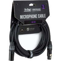 On-Stage’s Production-Grade Microphone Cables faithfully transmit audio to share your sound. XLR cables offer professional quality audio by transmitting balanced audio signals and minimizing interference, making them perfect for in-studio and live recordings. The locking on the XLR connectors prevents accidental disconnection, ensuring a stable and reliable signal. The double braided outer jacket ensures the cable doesn’t tangle when in use, while also protecting against scrapes and cuts. Its copper layer offers improved conductivity while minimizing the risk of corrosion, while the semiconductor shielding smooths the signal to reduce electronic noise and prevent distortion. FEATURES: Robust PVC outer jacket ensures the cable remains tangle free when in use Gold-plated connectors prevent corrosion and oxidation Double shield copper braiding with semiconductor shielding SPECIFICATIONS: Cable Length: 15ft (4.5m) Connectors: Gold-plated, XLR to XLR Construction: Oxygen-free copper Gauge: 24 AWG Outer Diameter: 8.6mm Shielding: Double-shielded (copper-braided and semiconductor shielding)