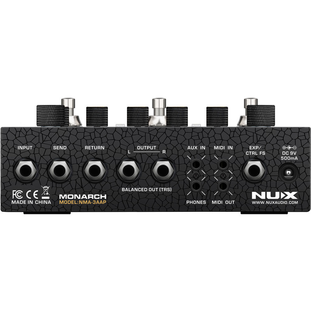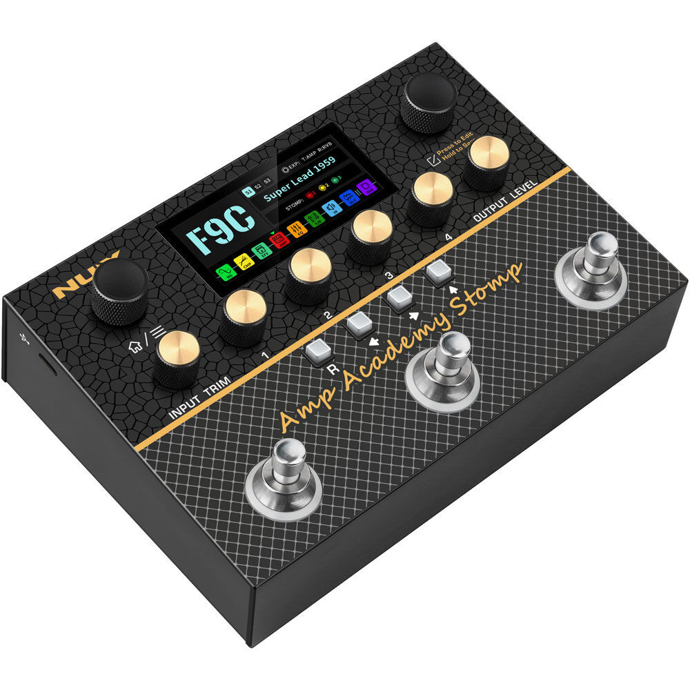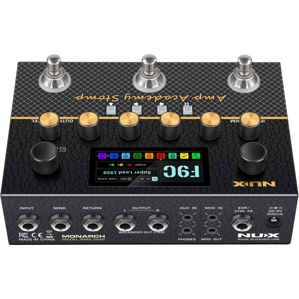 3-footswitch Modelers are an up-and-coming trend in the market. NUX heard your requests, and that’s the main reason for creating the AA Stomp... an end-to-end tone-shaping Amp Simulator, and independent L/R CYBER IR™ Engine, ushering in a milestone evolution for NUX. FEATURES: Stereo CYBER IR™ Engine with dual 1024 samples resolution. Independent Pre & Power amp simulation with TSAC-4K white-box amp modeling algorithm. World-class amp modeling algorithm with full functions. (Like 4 inputs for patch cable jumping.) Aluminum extrusion chassis. NG, EFX, AMP, I.R., EQ, S/R; DLY, RVB effect blocks with free/parallel routing order. 2.86” color LCD display (960 x 376) with intuitive operations. 27 preset slots with 3 scenes, independent L/R 60 IR slots. Pre/Post phrase loop for distance tone tweaking. (NBT-1 with APP) Footswitch setup, Global EQ, PHONES LEVEL, AUX IN LEVEL, OUT LEVEL, Quick Block, Tuner in global setting. USB audio interface, firmware update, PC edit software, NBT-1, …etc. USB-C, stereo balanced 1/4" outs, phones out for silent practice, 1/8" MIDI I/O, EXP out with additional NMP-2 Lite. Great Dynamic Range: 111dB Ultra-low latency: 2ms Monarch Editor: User-friendly interface for easy sound customization, parameter tweaking, and patch management. SPECIFICATIONS: Pedal Type: Amp Modeling, Multi-FX Analog/Digital: Digital Presets: 27 x Factory, 27 x User Number of EFX blocks: 9 (NG, CMP, EFX, AMP, EQ, S/R, IR, DLY, RVB) Impulse Responses: Left & Right, 60 x Factory Cyber IRs, 40 x User IRs USB: USB-C for 24-bit / 48kHz USB AUDIO, USB MIDI (PC Editor), firmware update, NBT-1 Bluetooth Module with APP control Bluetooth: Additional NBT-1 Bluetooth Module with APP control Expression Control: Yes, external EXP or additional NMP-2 Lite footswitch Bypass Switching: Buffered Bypass Software: Amp Academy Stomp editor (PC), Amp Academy Stomp APP INPUT/RETURN Impedance: 1M Ohms AUX IN Impedance: 10k Ohms OUTPUT L/R Impedance: 100 Ohms (Balanced) SEND Impedance: 1k Ohms PHONES OUT Impedance: 10 Ohms INPUT to OUTPUT L/R Dynamic Range: 111dB Sampling Rate: 48kHz / 32bit System Latency: 2ms minimum Power: 9V DC (Center Negative) Current Draw: < 500mA Dimensions (L x W x H): 183 x 30 x 65.3 mm Weight: 0.9kg (1.98lbs) TSAC-4K Physical Modeling Algorithm with Separated Preamp & Power Amp Combination. The Amp Academy Stomp features our iconic TSAC-4K Amp Modeling (White-box Physical Modeling algorithm), which is twice as complex found in previous versions. This led us to design a new hardware platform with 2 DSPs, one to handle all the effects, and the other to handle the amp modeling algorithm. Now we even split Amp Modeling as separated preamp and power amp simulation. It means you can choose different power tubes to drive the creative sound. Additionally, the Amp Academy Stomp uses premium A/D & D/A converters and analog circuits to achieve a clear sound with low noise levels. Cyber IR Our Brand New Cyber IR™ Technology is a real Impulse Response reproduction with a premium algorithm that offers Microphone, Position, and Distance adjustments. Amp Academy Stomp gives you Stereo IR Capabilities with ultra-low latency. Parallel/Serial DLY & RVB blocks In Parallel Mode, Delay and Reverb blocks can make your signal cleaner and sound stronger. Serial/Branch Send/Return Routing In Serial Mode , the AA Stomp makes use of the Send/Return in a more traditional sense. In Branch Mode , the Send jack sends the signal before the IR signal block to a real amplifier (Power Amp In), while simultaneously sending the outputs with IR signals to the PA system or FRFR amp. Scene/Stomp Modes You can assign the foot switches in Global Settings. Let’s explain the concepts of PRESET and SCENE: PRESET = A complete effects signal chain. SCENE = A snapshot of a specific effects signal chain, including the switching of effects modules and the setting changes of parameters. So, SCENE can be imagined as the effect switches and tone changes you may need in a song. For example, the main song is S1, the chorus is S2, and the interlude is S3. The advantage of doing this is that your naming is in a PRESET, and since the effect signal chain is fixed, there will be lower switching noise and delay when the effector switches SCENE. Another secret is to select the same model to switch the Delay on and off when setting your SCENE, which can achieve an effect "Tail". Balanced 1/4" Outputs 1/4" Balanced TRS (Tip-Ring-Sleeve) outputs reduce noise interference and transmit signals over long distances. MIDI In/Out All the MIDI commands can be found in the editor. EXP/CTRL FS 1/4" jack with NMP-2 Lite FS The NMP-2 Lite is included, it makes the Amp Academy Stomp more versatile with live application. Quick Block Design The Amp Academy Stomp has an intuitive Quick Block Design, letting you assign any effect to the four buttons on the third row through the global menu. This allows for quick activation or deactivation of key tones. By holding a button, you can also access the module’s editing interface for fast, real-time sound adjustments. 30 Seconds Stereo Phrase Loop with PRE/POST Position The AAS also includes a 30 second stereo phrase looper. This powerful little looper can be used in either Auto Record or Normal Record modes. Additionally, it can be set to the pre or post position in the signal path. This is also incredibly useful live with the included NBT-1 Bluetooth Module and accompanying iOS/Android App. Set up a loop in Pre Mode, let the loop play back and use the App to adjust your tone from anywhere in your live venue for the best possible tone. USB Audio Interface As laptops continue to include fewer USB ports, users often rely on USB hubs or adapters, which can disrupt the plug-and-play experience and potentially cause conflicts. The NUX Amp Academy Stomp also serves as a USB audio interface, minimizing setup time and freeing up space, allowing you to focus more on playing and creativity. The Best of Both Worlds: Mo