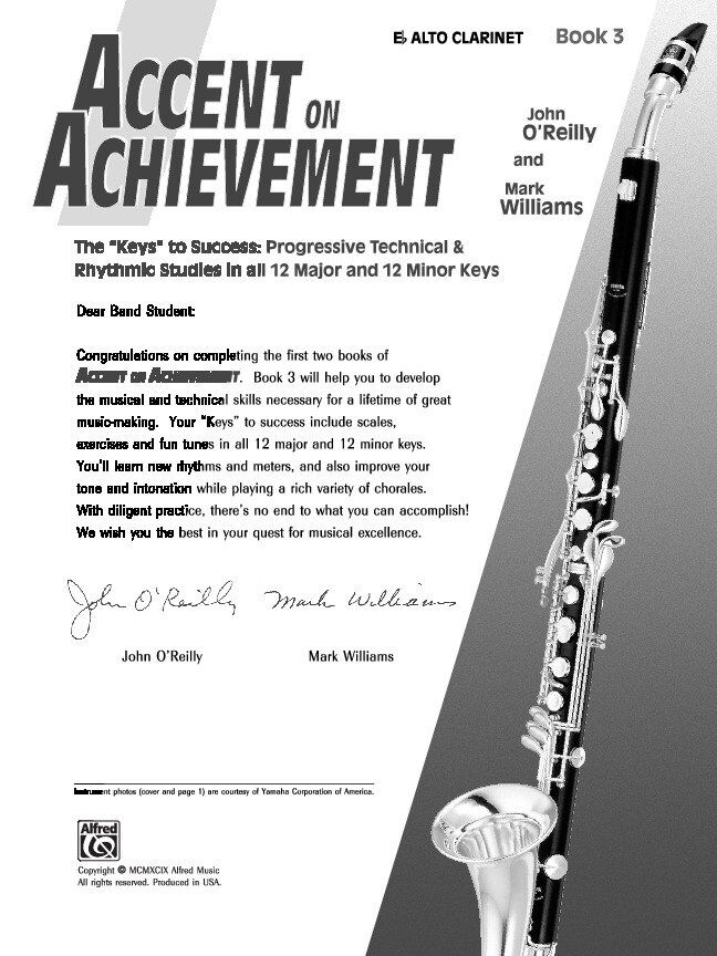 Accent on Achievement is a revolutionary best-selling band method that will excite and stimulate your students through full-color pages and the most complete collection of classics and world music in any band method. The comprehensive review cycle in books 1 & 2 will ensure that students remember what they learn and progress quickly. Also included are rhythm and rest exercises chorales scale exercises and 11 full band arrangements among the first two books. Book 3 includes progressive technical rhythmic studies and chorales in all 12 major and minor keys. Also included are lip slur exercises for increasing brass instrument range and flexibility. Accent on Achievement meets and exceeds the USA National Standards for music education grades five through eight. Accent on Achievement Book 3 Eb Alto Clarinet Composer: John O'Reilly|Mark Williams Publisher: Alfred Music Instrument: Clarinet Pages: 40 Series: Accent on Achievement