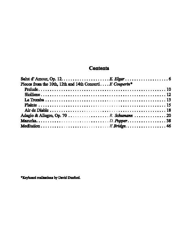 Solos for Young Cellists is an eight-volume series of music compilations with companion CDs. The series ranges from elementary to advanced levels and represents a truly exciting variety of musical genres and techniques. This collection of wonderful music offers young cellists the opportunity to work in various positions, techniques, meters, keys, and musical styles. Many of the works have long been recognized as stepping stones to the major instrumental repertoire, while others are newly published pieces and original compositions, providing an exciting and diverse choice of study. The collection will become a valuable resource for teachers and students of all ages and levels. The piano track recorded on the second half of each CD gives the cellist the chance to practice performing with accompaniments. Companion CD to Volume 5 is 00-24482. Contents * Salut d' Amour, Op. 12- E. Elgar * Pieces from the 10th, 12th and 14th Concerti- F. Couperin (Keyboard realizations by David Dunford) Siciliene La Tromba Plainte Air de Diable* Adagio & Allegro, Op. 70- R. Schumann * Mazurka- D. Popper * Meditation- F. Bridge * Julie-O- M. Summer/arr. C. Cheney. Solos for Young Cellists Cello Part and Piano Acc. Vol. 5 Publisher: Alfred Music Instrument: Cello Pages: 76 Series: Solos for Young Cellists