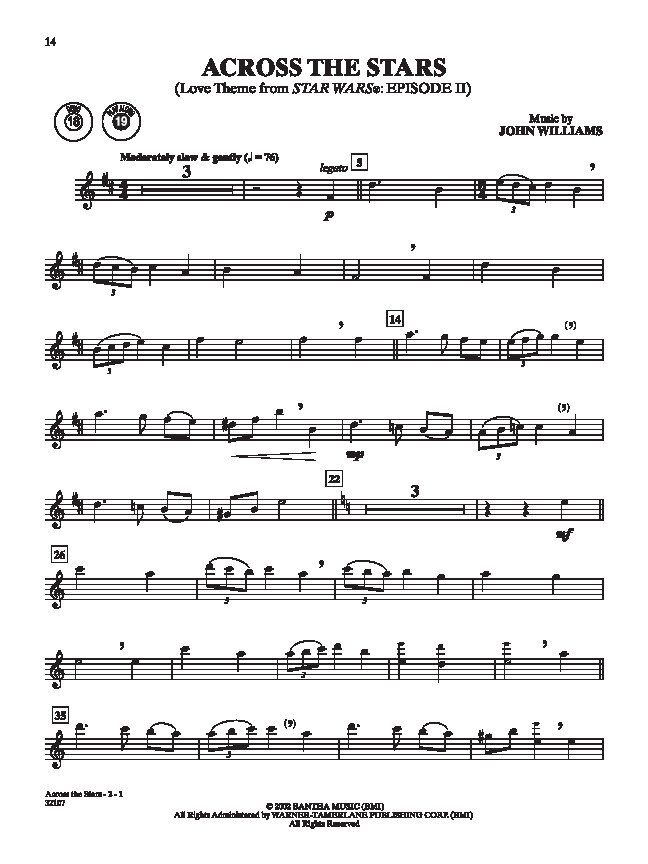 For the first time, Star Wars A Musical Journey (Music from Episodes I-VI): Instrumental Solos includes selections from all six Star Wars movies arranged for Flute, Clarinet, Alto Sax, Tenor Sax, Trumpet, Horn in F, Trombone, Piano Accompaniment, Violin, Viola and Cello. The arrangements are completely compatible with each other and can be played together or as solos. Due to level considerations regarding keys and instrument ranges, the wind instrument arrangements are not compatible with the string instrument arrangements in this series. Each book contains a carefully edited part that is appropriate for the Level 2--3 player and a fully orchestrated accompaniment CD. Each song on the CD includes a demo track, which features a live instrumental performance, followed by the play-along track itself. Also included is 4-color art as well as black and white art from the movies. Titles:Episodes I -- VI1. Star Wars (Main Theme) Episode I: The Phantom Menace2. Jar Jar's Introduction3. Augie's Great Municipal Band4. Qui-Gon's Funeral5. Duel of the Fates6. Anakin's Theme7. The Flag ParadeEpisode II: Attack of the Clones8. Across the Stars9. The Arena10. The Meadow PicnicEpisode III: Revenge of the Sith11. Battle of the HeroesEpisode IV: A New Hope12. Cantina Band13. The Throne RoomEpisode V: The Empire Strikes Back14. The Imperial March15. May the Force be With YouEpisode VI: Return of the Jedi16. Princess Leia's Theme This title is available in SmartMusic. Star Wars A Musical Journey Episodes I-VI - Alto Sax Composer: John Williams Publisher: Alfred Music Instrument: Saxophone Pages: 32 Series: Pop Instrumental Solos Series