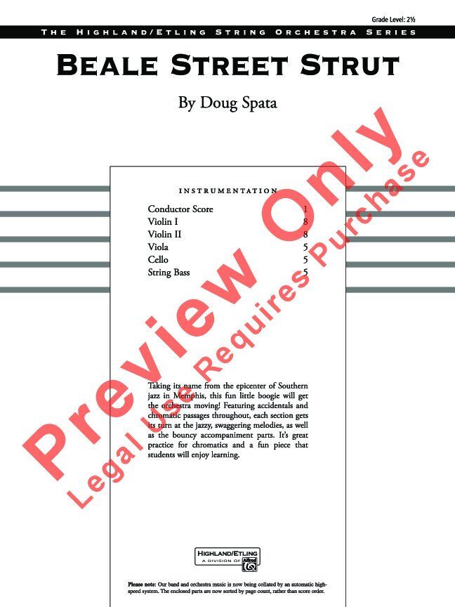 Beale Street Strut - SO2.5 String Orchestra by Doug Spata, 62 Pages, Highland/Etling Series, Published by Alfred Music